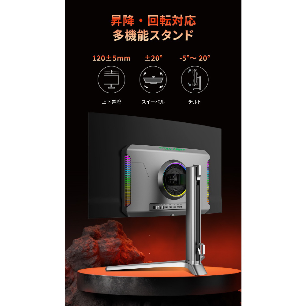 付属スタンドにより正確な上下昇降、チルト、スイーベルなどが可能です。75×75サイズのVESAマウント(別売)に対応しています。