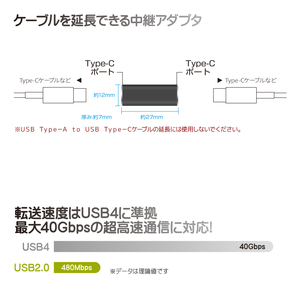 USB Type-C用中継アダプター 中継ストレート型。ケーブルを延長できます。ストラップホール付き。