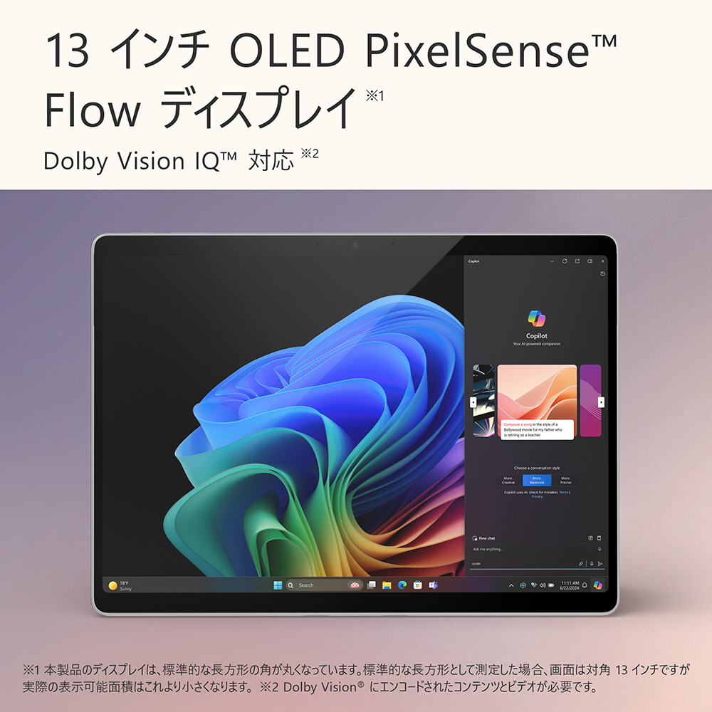 これまでで最も柔軟で、最もパワフルな 2-in-1 ノート PC。AI でパワーアップした Copilot エクスペリエンスと機能を搭載し、外出先でもずっと使える第 11 世代 Surface Pro、Copilot+ PC は、新しい概念のノート PC です