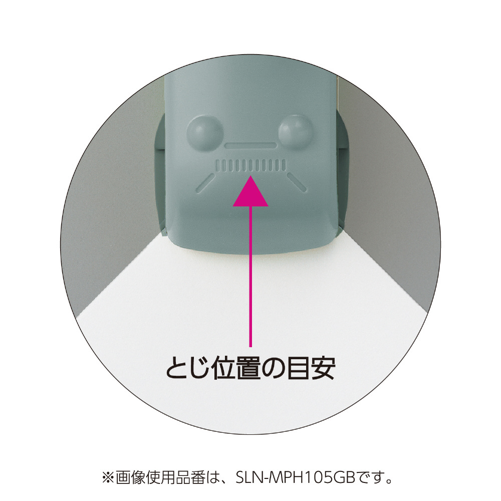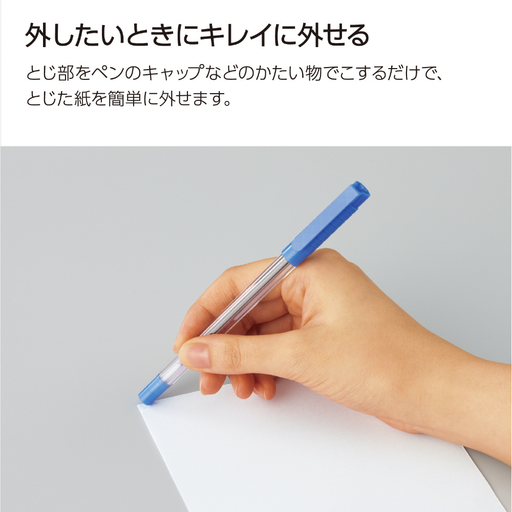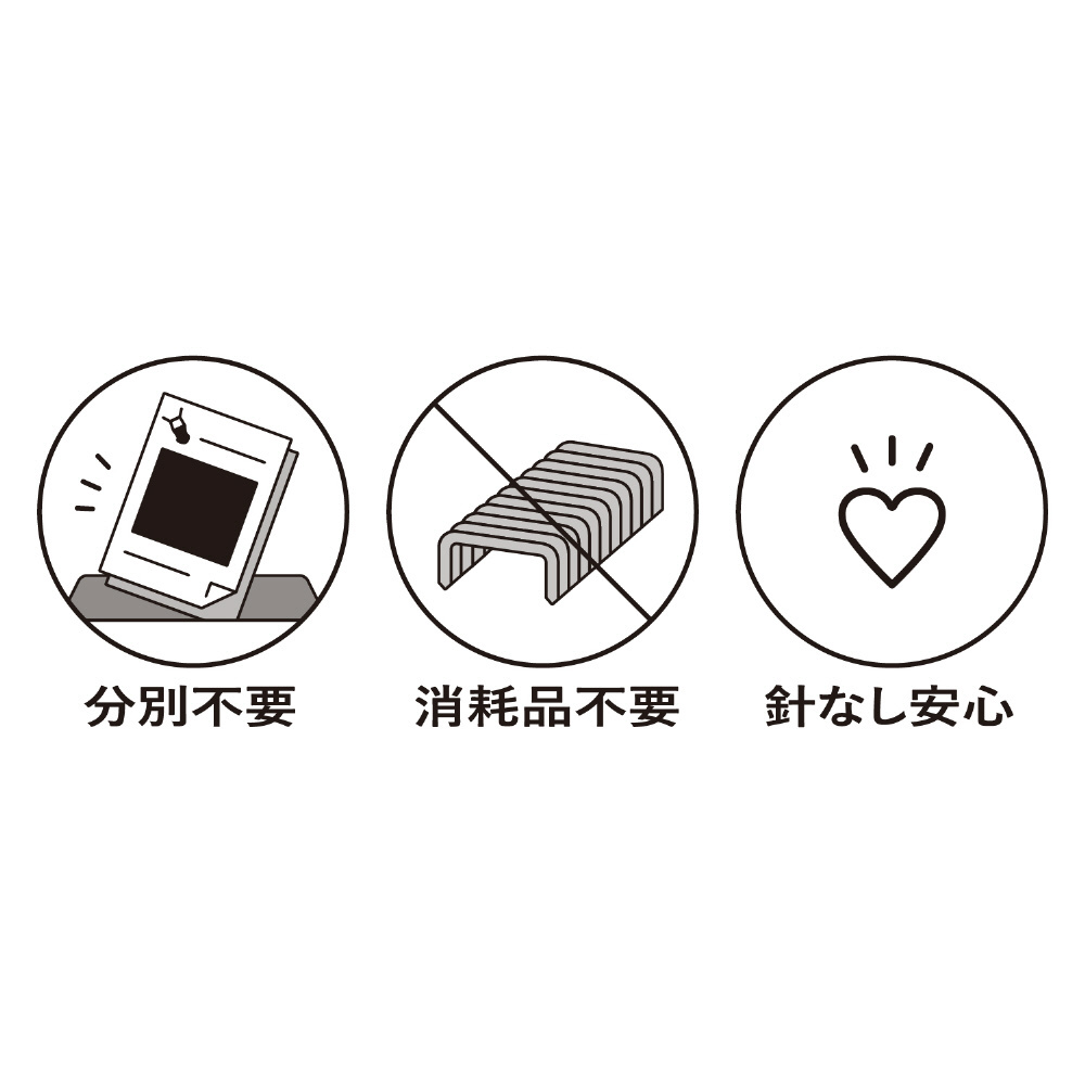 ●針を使わずに紙をとじる/針を使わずに紙をとじることができるので、針補給の必要がありません。また、とじた紙を廃棄する際に分別する必要がなく、針が他のものに混入する心配もありません。