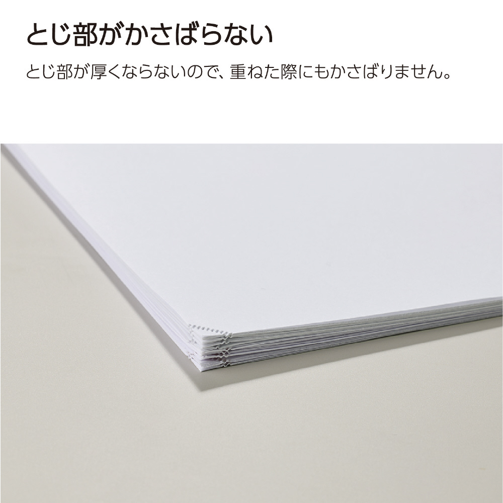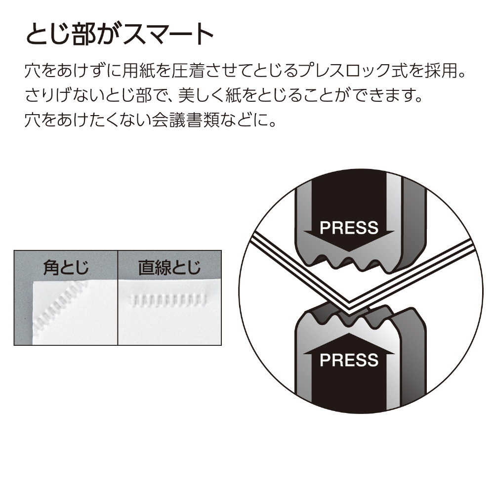 ●とじ部がスマート/穴をあけずに用紙を圧着させてとじるプレスロック式を採用。さりげないとじ部で、美しく紙をとじることができます。