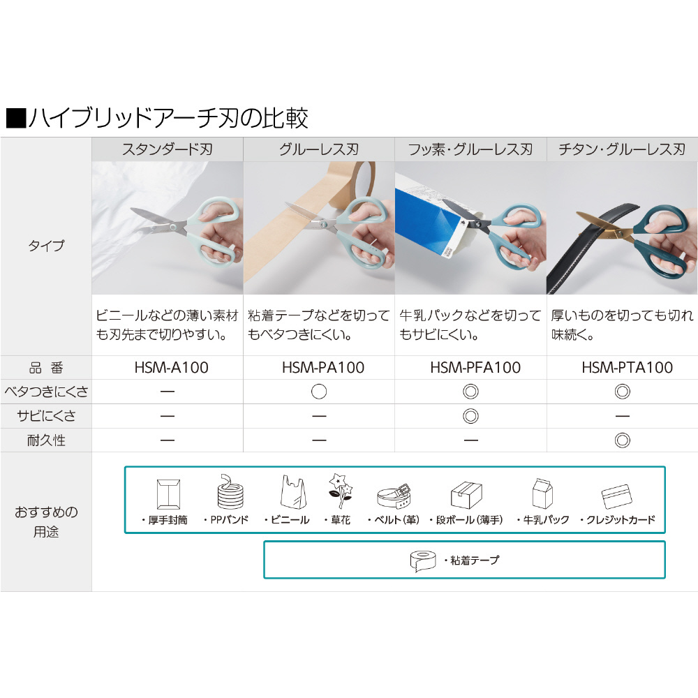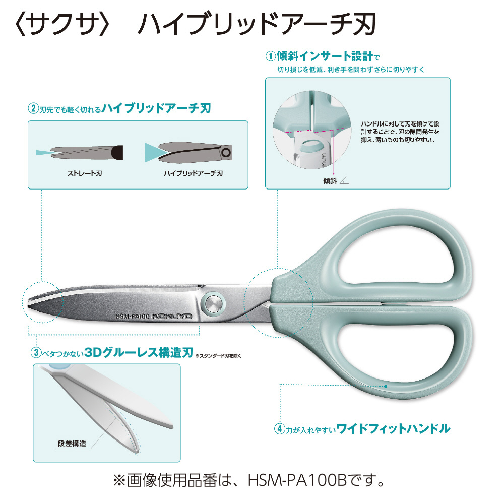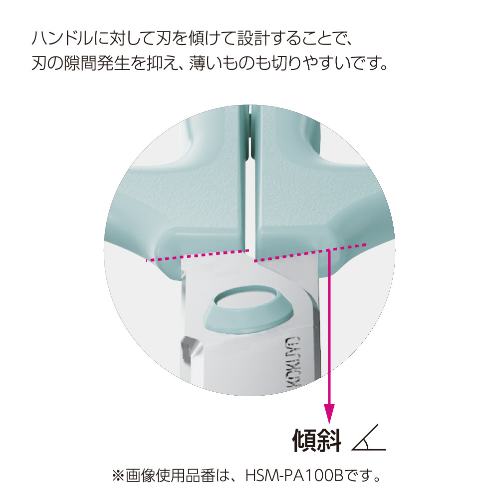 ●コクヨ開発「ハイブリッドアーチ刃」搭載で、刃先にかけて刃の角度が徐々に広がっているため、今まで切りにくかったものも根元から刃先まで軽い力で切れます