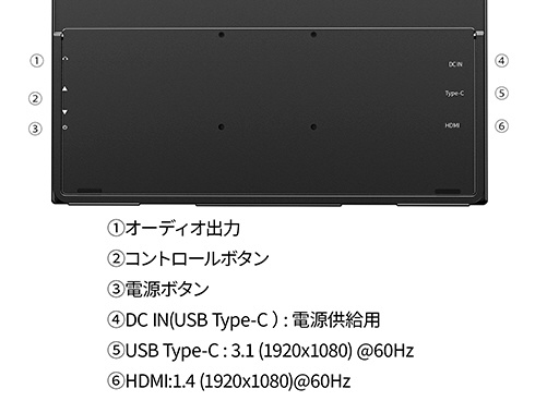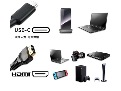 ■入力端子としてハイブリッド対応(モニターへの電源と映像を1本で送信)のUSB Type-Cを1つ、USB Type-C(電源供給用)を1つ、さらにHDMI 1.4を1つ装備します。*HDMI使用時にはUSB Type-C端子から電源供給が必要になります。USB Type-Cケーブル1本で電力供給と映像表示が可能となっており、ケーブルまわりがスッキリします。