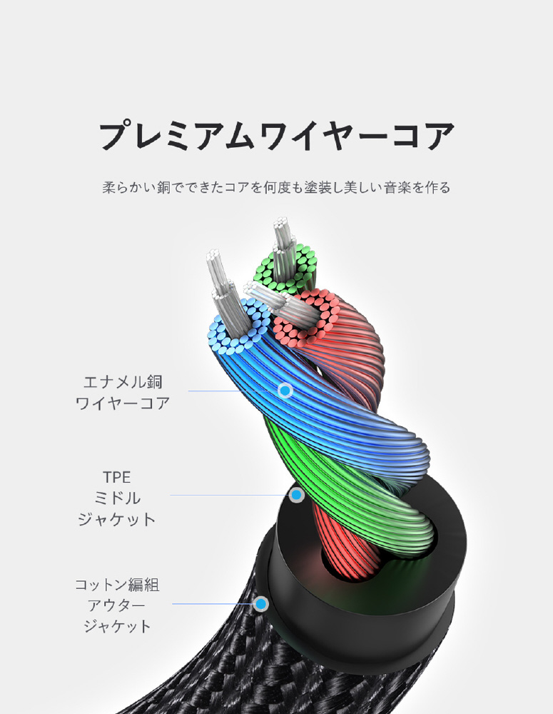 Hi-Fi オーディオ品質で、電子音やオーディオノイズにさようなら。最先端のデザイン&金メッキインターフェイス付きアルミニウム合金シェル。プレミアムコットン編組ジャケットを使用。6000回以上の屈折や50kgの重量にも耐える優れた耐久性を実現。