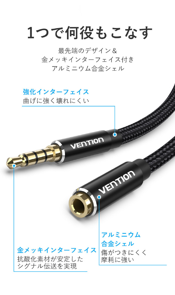 3.5mmステレオミニプラグの延長ケーブル。4極端子なのでマイク付きヘッドホンなどにも対応。プレミアムコットン編組ジャケットを使用。6000回以上の屈折や50kgの重量にも耐える優れた耐久性を実現。高品質の銅線、光沢のある金属コネクタで設計されています。信号の損失とノイズを排除し、クリアなステレオサウンドを提供します。