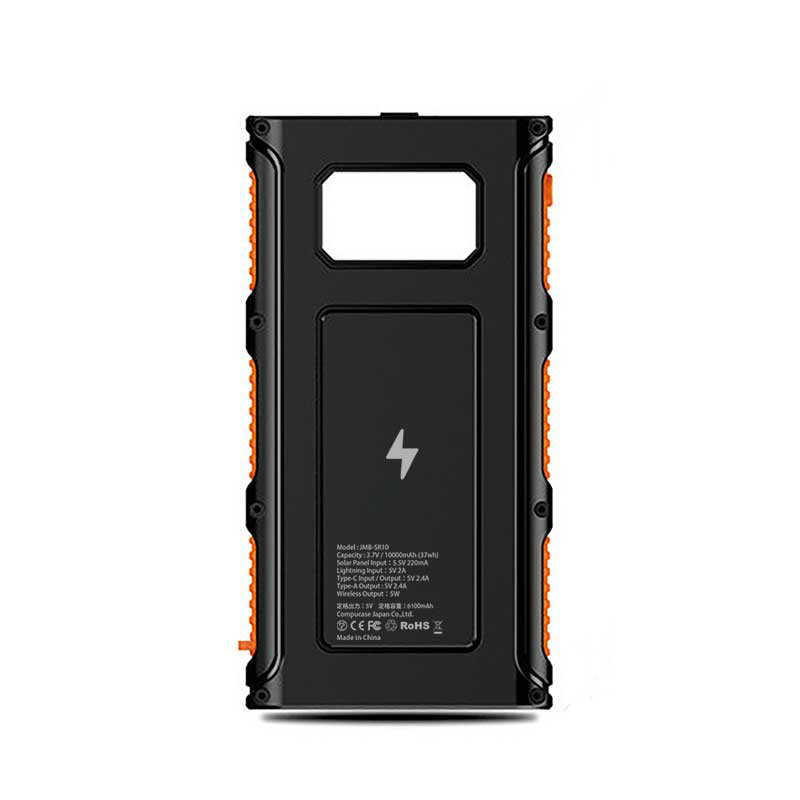 ソーラーパネル付きモバイルバッテリー 10000mAh ワイヤレスチャージャー搭載 防塵防水IP66仕様 防災仕様(SOSライト搭載)
