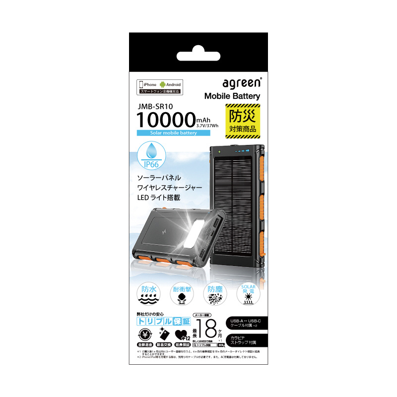 ソーラーパネル付きモバイルバッテリー 10000mAh ワイヤレスチャージャー搭載 防塵防水仕様 全額返金トリプル保証 agreen ブラックオレンジ JMB-SR10-BKOR