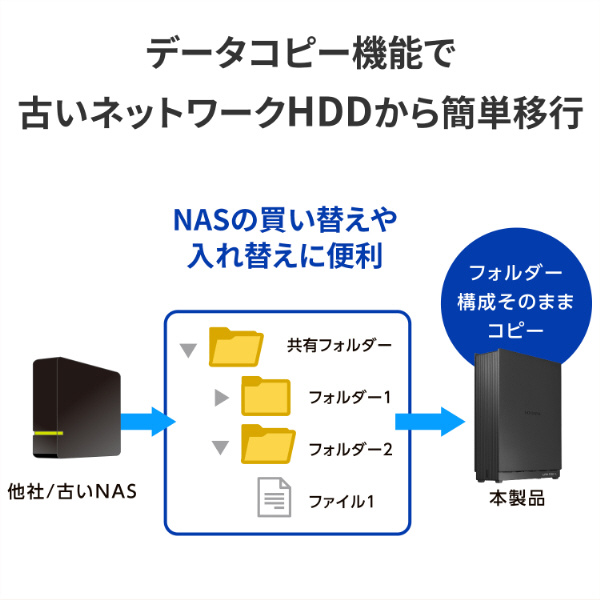 古いネットワークHDDのデータを、ツリー構造をそのまま保持して本商品にコピーできるため、買い替え時のデータ移行がスムーズに行えます。