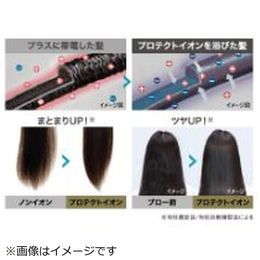 プロテクトイオン搭載で、髪のツヤをアップ。マイナスイオンとプラスイオンを同時に放出することで、それぞれのイオンが髪に働いて、髪の広がりや傷みの一因となる静電気を抑制します。 ※放出イオン量:約1,000万個/cm3以上。当社測定法/当社比較法による