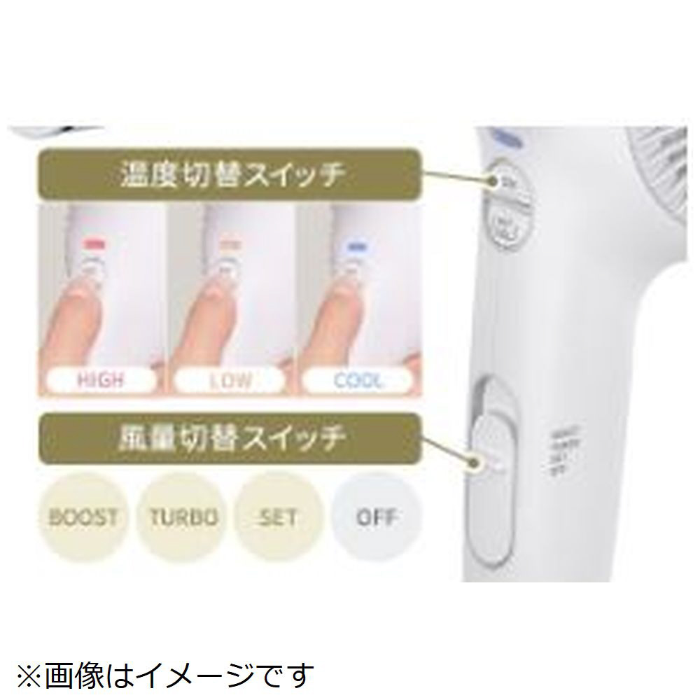 ■コンセントタイプ:風量切替スイッチ BOOST/TURBO/SET/OFF、温度切替スイッチ HIGH/LOW/COOL、温冷自動切替スイッチ ON/OFF