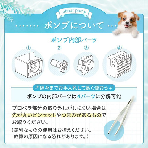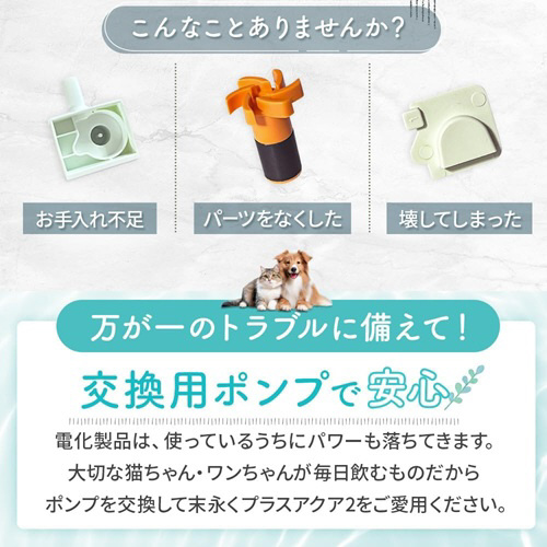 交換用ポンプで安心 電化製品は、使っているうちにパワーも落ちてきます。大切な猫ちゃん・ワンちゃんが毎日飲むものだからポンプを交換して末永く、プラスアクア2をご愛用ください。