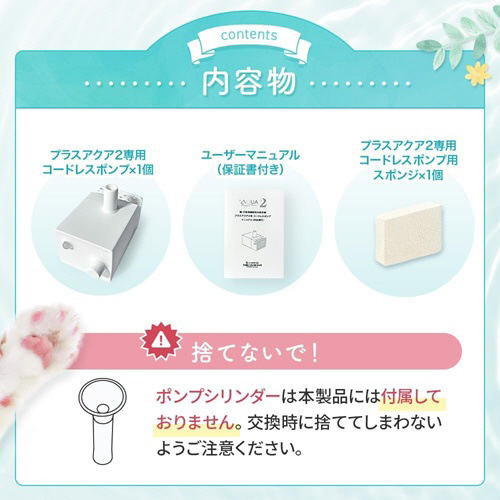 ・プラスアクア2専用コードレスポンプ×1個、ユーザーマニュアル(保証書付き)、プラスアクア2専用コードレスポンプ用スポンジ