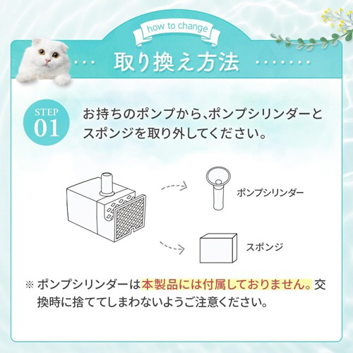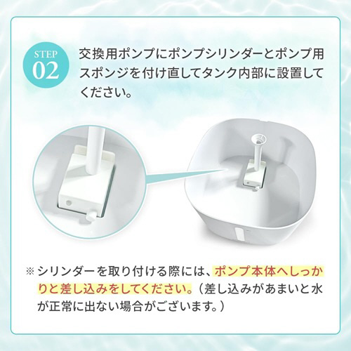 STEP2:交換用ポンプにポンプシリンダーとポンプ用スポンジを付け直して内部タンクに設置してください。 ※シリンダーを取り付ける際には、ポンプ本体へしっかりと差し込みをしてください。(差し込みがあまいと水が正常に出ない場合がございます。)