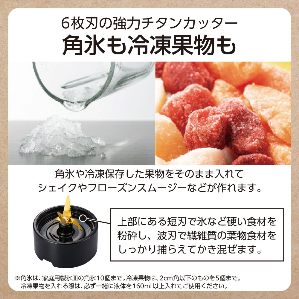 ※角氷は、家庭用製氷皿の角氷10個まで。冷凍果物は、2cm角以下のものを5個まで。冷凍果物を入れる際は、必ず一緒に液体を160ml以上入れてご使用ください。