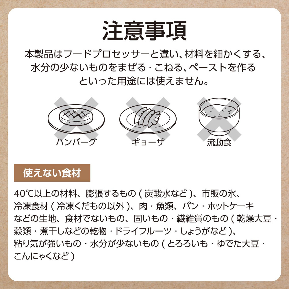 ミキサーで使えない材料:40℃以上の材料、膨張するもの(炭酸水など)、市販の氷、冷凍食材(冷凍くだもの以外)、肉・魚類、パン・ホットケーキなどの生地、食材でないもの、固いもの・繊維質のもの(乾燥大豆・穀類・煮干しなどの乾物・ドライフルーツ・しょうがなど)、粘り気が強いもの・水分が少ないもの(とろろいも・ゆでた大豆・こんにゃくなど)