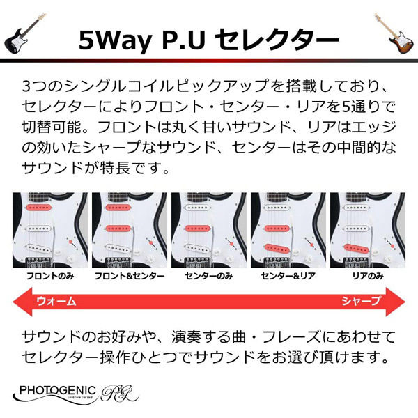 ・3つのシングルコイルピックアップを搭載 / セレクターによりフロント・センター・リアを5通りで切り替え可能 / サウンドのお好みや、演奏する曲・フレーズにあわせてセレクターの操作ひとつでサウンドを選択いただけます