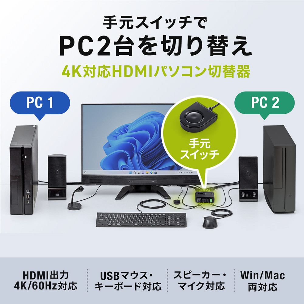 パソコン切替器 [HDMIディスプレイ / USBキーボード・マウス / スピーカー・マイク対応] 手元切替スイッチ (Mac/Windows11対応) SW-KVM2WHUUS [2入力 /1出力 /4K対応 /手動]