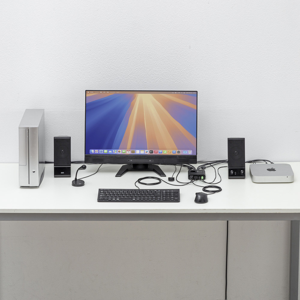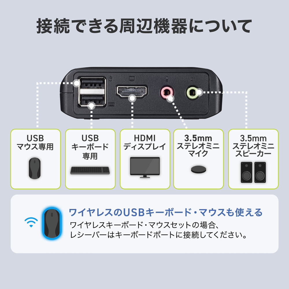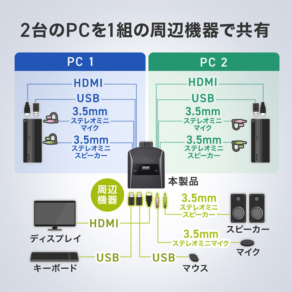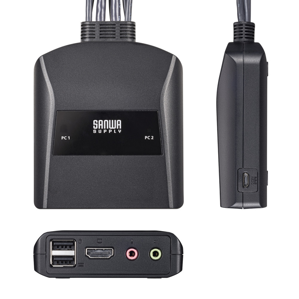 パソコン2台を1組のHDMIディスプレイ・USBキーボード・USBマウスで切替えて使用できる4K/60Hz対応、手元切り替えスイッチ付きのパソコン自動切替器。