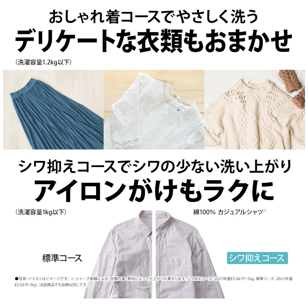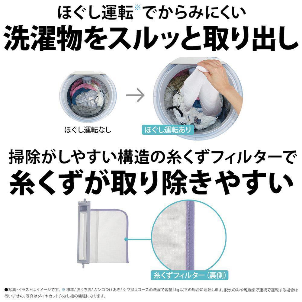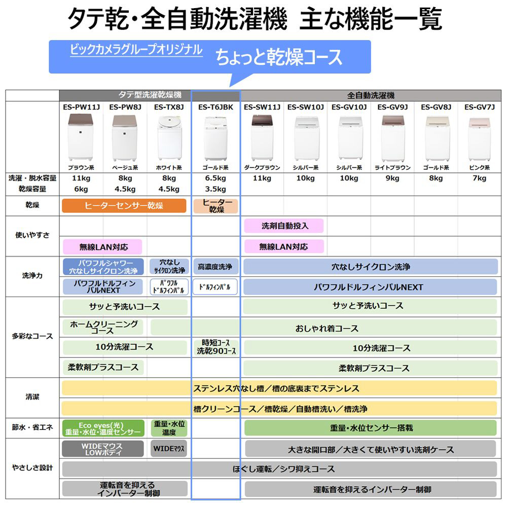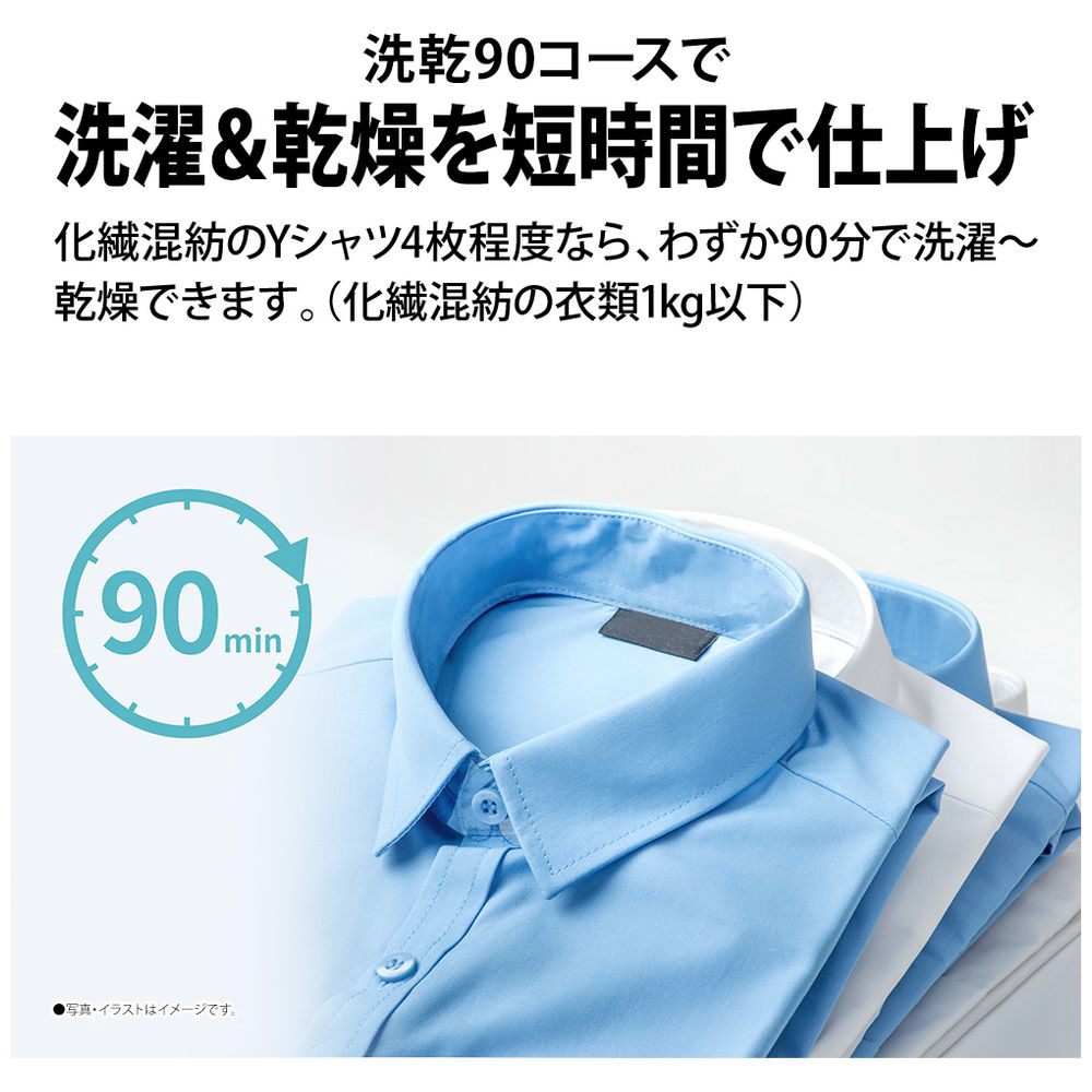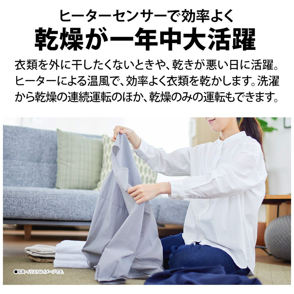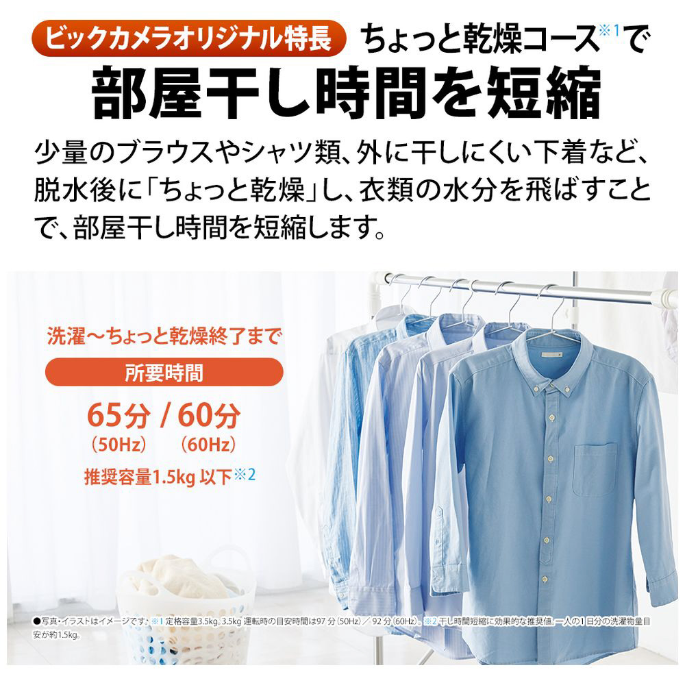 穴なし槽だから清潔&節水!効率よく乾燥まで行える「ヒーター乾燥」搭載。ビックカメラオリジナル特徴「ちょっと乾燥コース」で少量のブラウスやシャツ類、外に干しにくい下着などの部屋干し時間を短縮 。