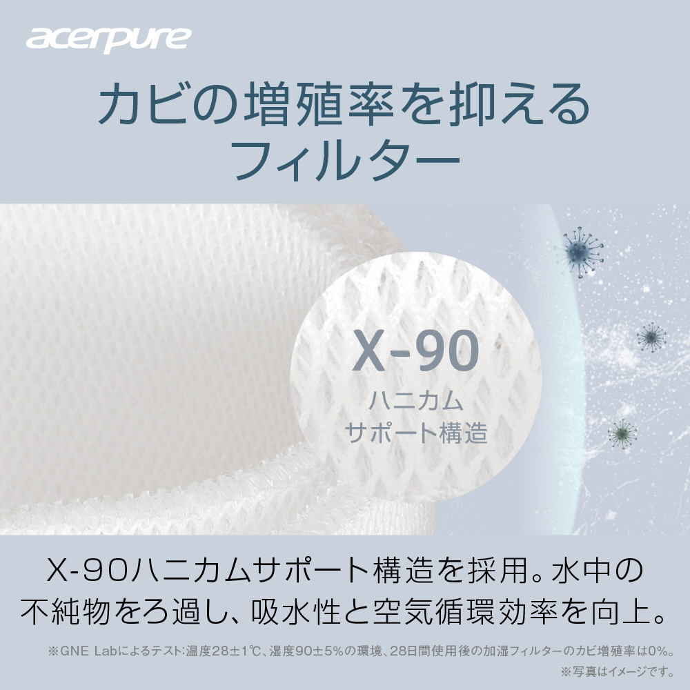 * GNE Labによるテスト済み。温度28±1℃、湿度90±5%の環境下で、28日間使用後の加湿フィルターのカビ増殖率は0%。