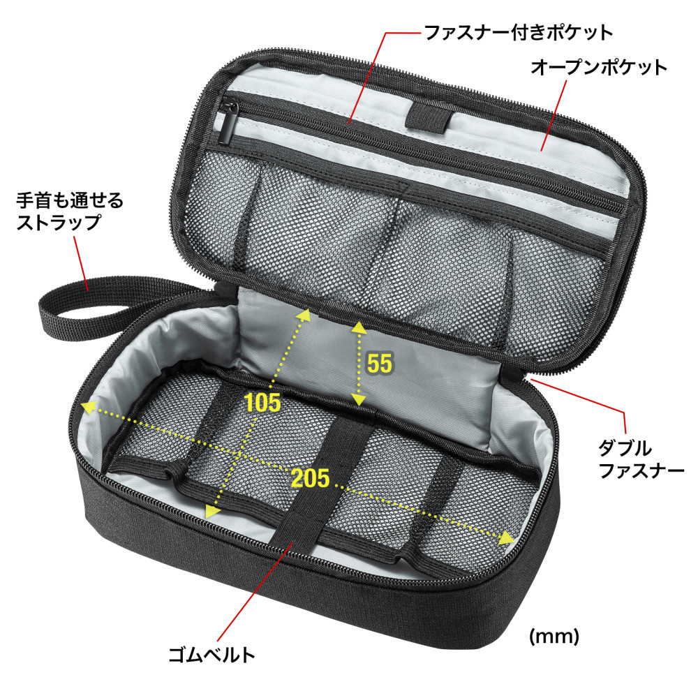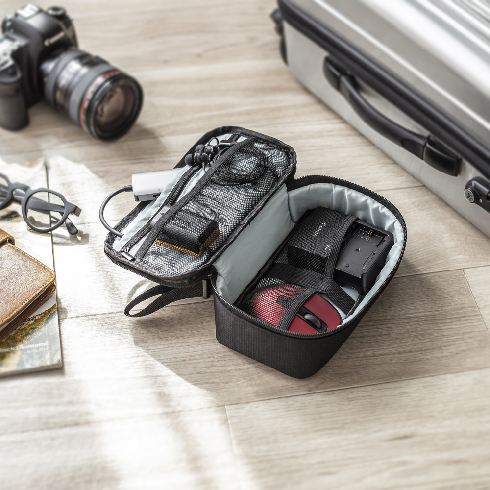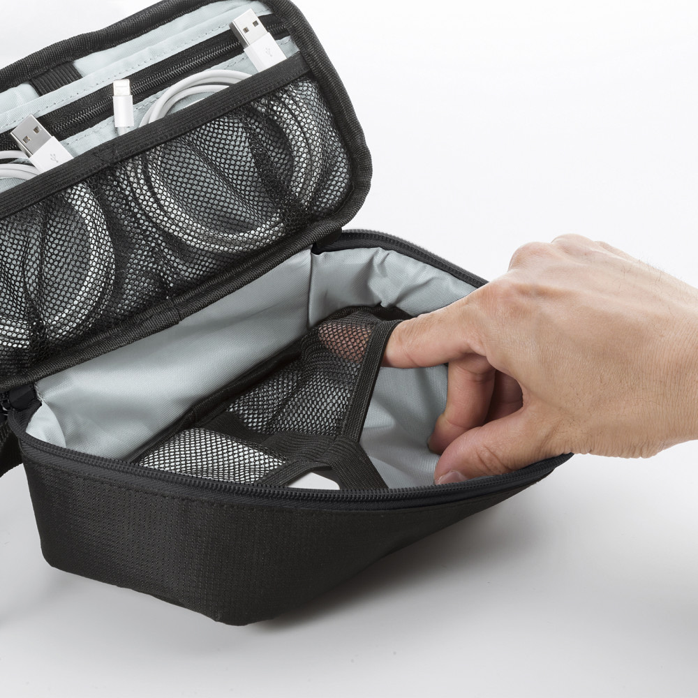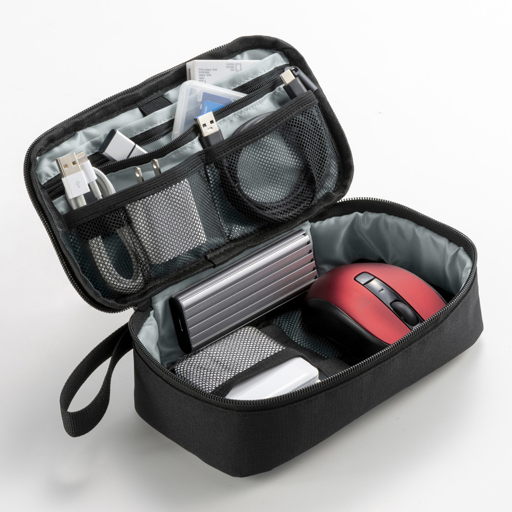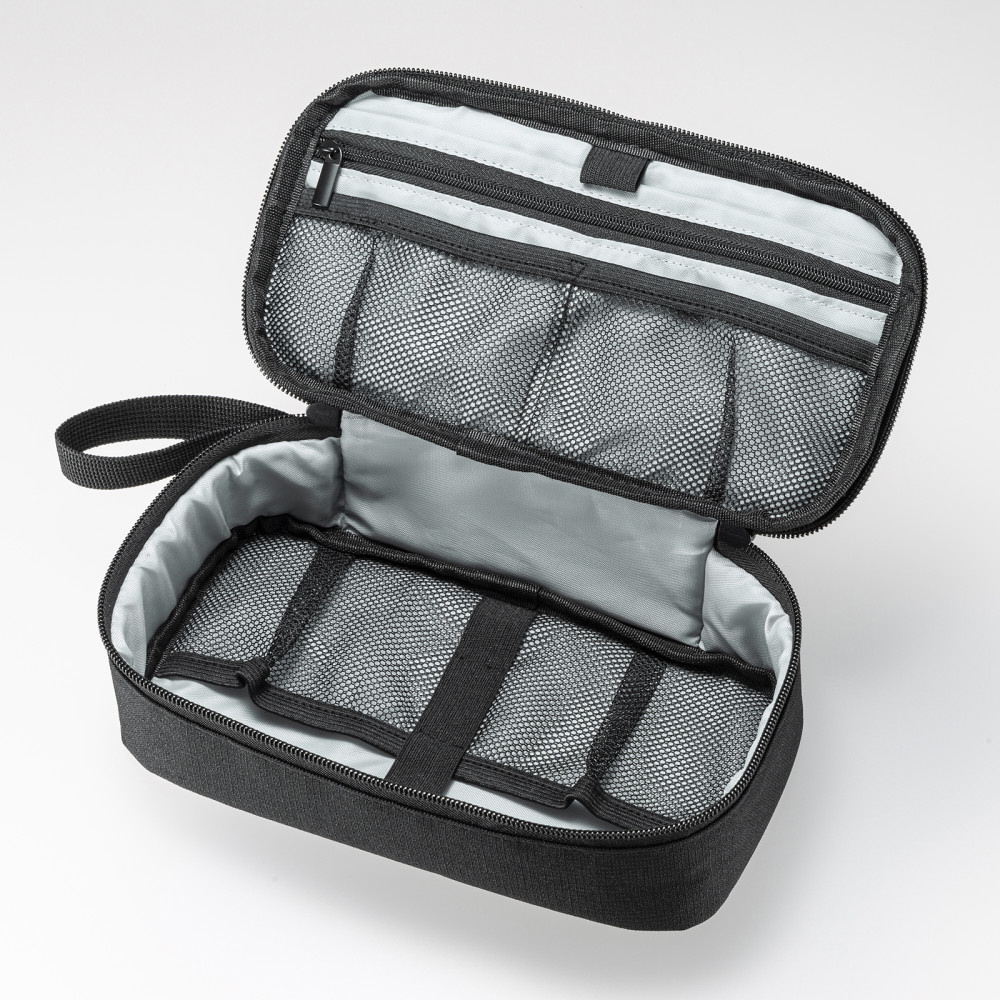 モバイルバッテリーやアダプタなどの小物をまとめてすっきり整理収納できるコンパクトポーチ。幅215×奥行115×高さ65mm。