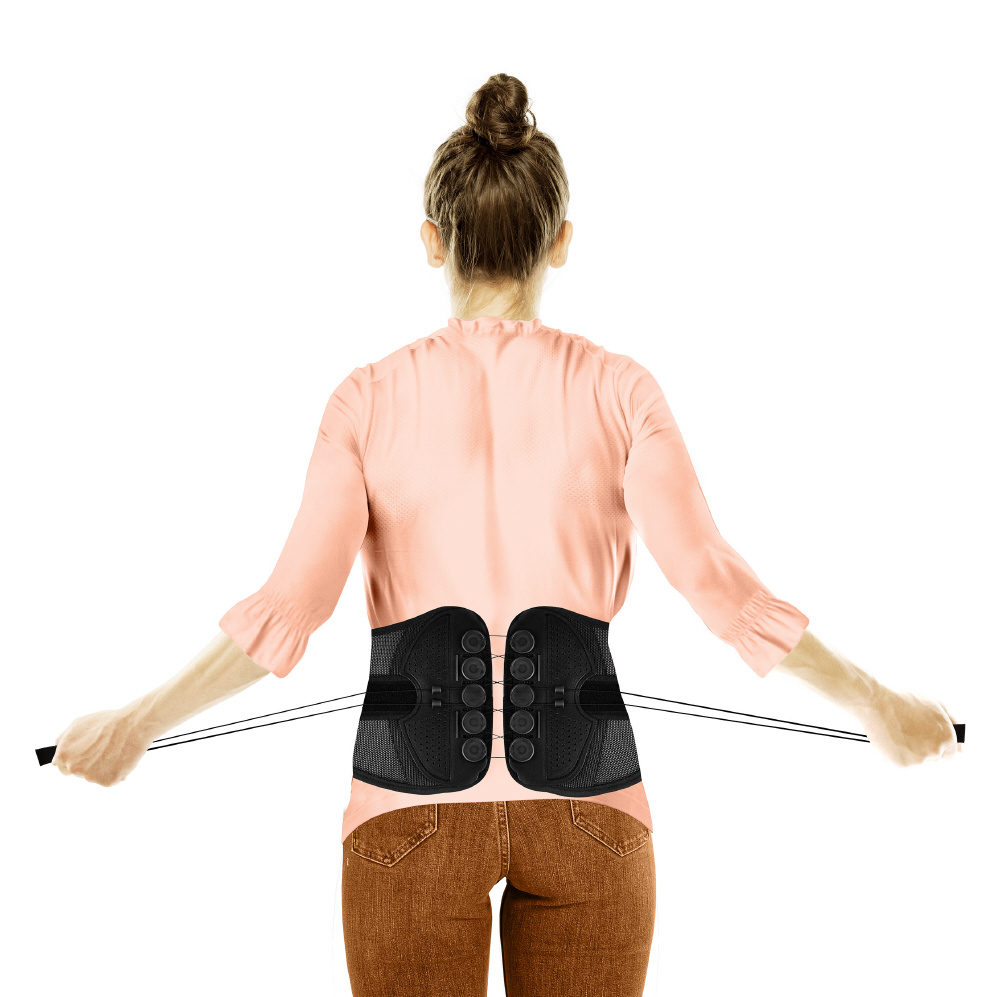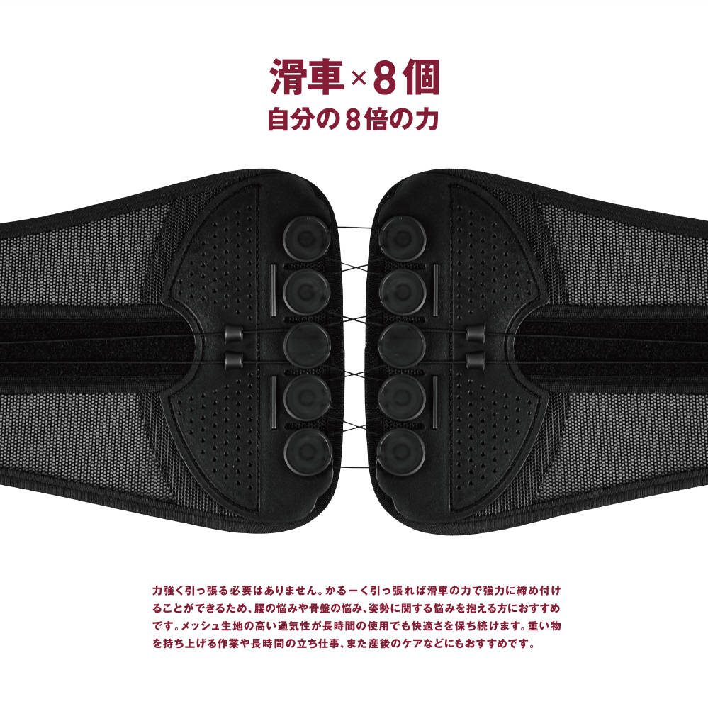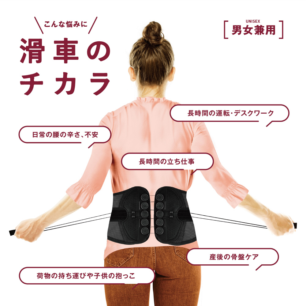 ベルトを腰や骨盤周りに巻き付けて、紐を左右に引っ張るとギューッと締め付ける腰・骨盤サポーターです。