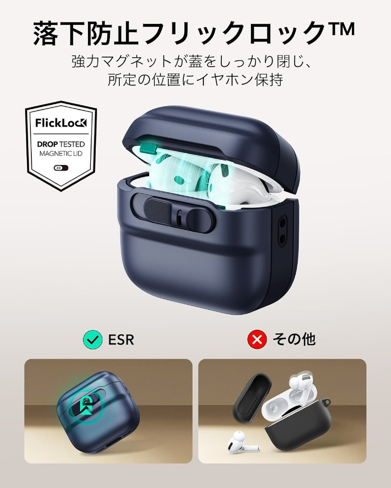 フタの上部および底部に700gの保持力を持つ強力なマグネットと内部のラッチにより、AirPodsを中に安全にロックし、落としてしまった際に飛び出すことはありません。