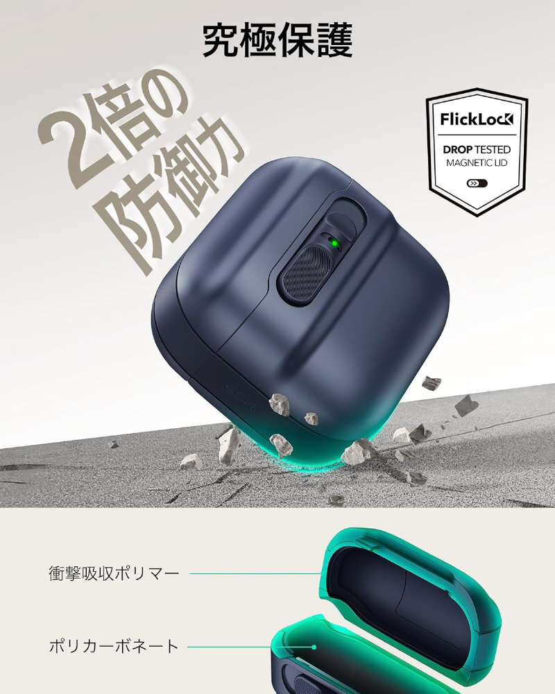 超硬質シェルと柔軟な衝撃吸収コアにより、二重防御を実現し、充電ケースをしっかりと保護し、きれいなまま保ちます。