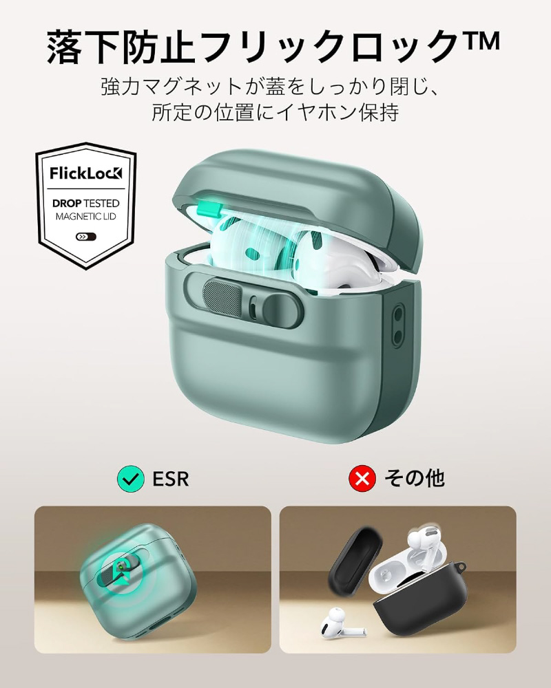 Pulse AirPods 第4世代用イヤホンケース MagSafe対応 スライド式オープン設計 ESR グリーン 1C0130502