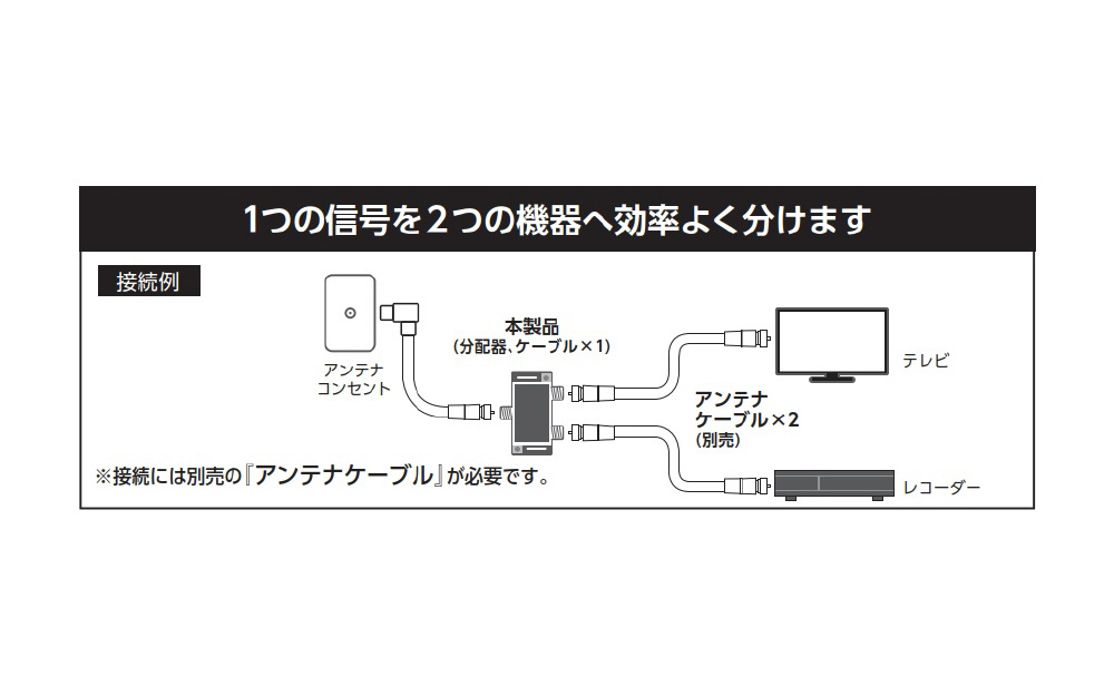 1つのアンテナ信号を効率良く分配します。本製品を使用することにより、レコーダーなどの周辺機器や、別室にあるテレビなど、2台の機器へ分配した信号を送ることが可能になります。