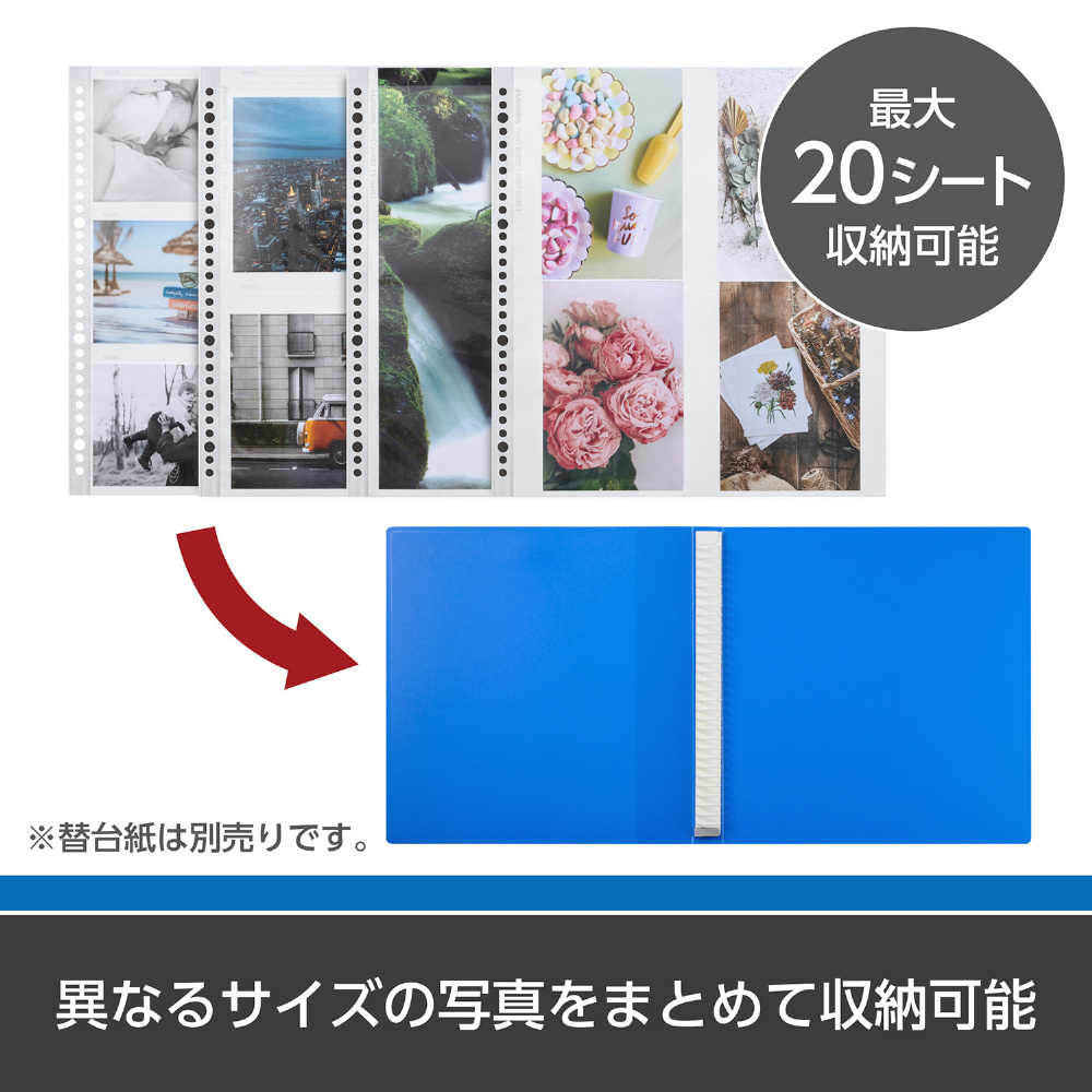 台紙差し替え可能なバインダー式の写真収納ファイルです。別売りの替台紙を最大20シート収納できます。
