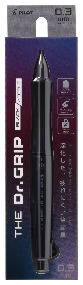 深化した、疲れにくい筆記具の定番 ザ・ドクターグリップにBLACK ACCENTシリーズが仲間入り。黒のパーツでアクセントを効かせたクールなデザイン。人間工学に基づき無理なく握れて疲れにくいグリップ。静音設計によりフレフレで発生する音とノック音が低減しました。ON/OFFの切り替えが可能なフレフレロック機構で、不意な芯出を防止します。※ロック時でも、ノブノックによる芯出しは可能です。