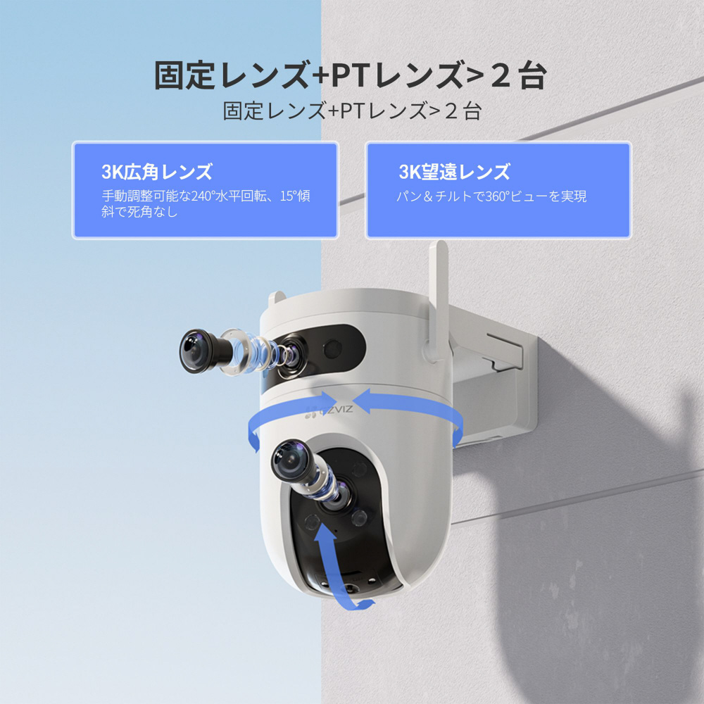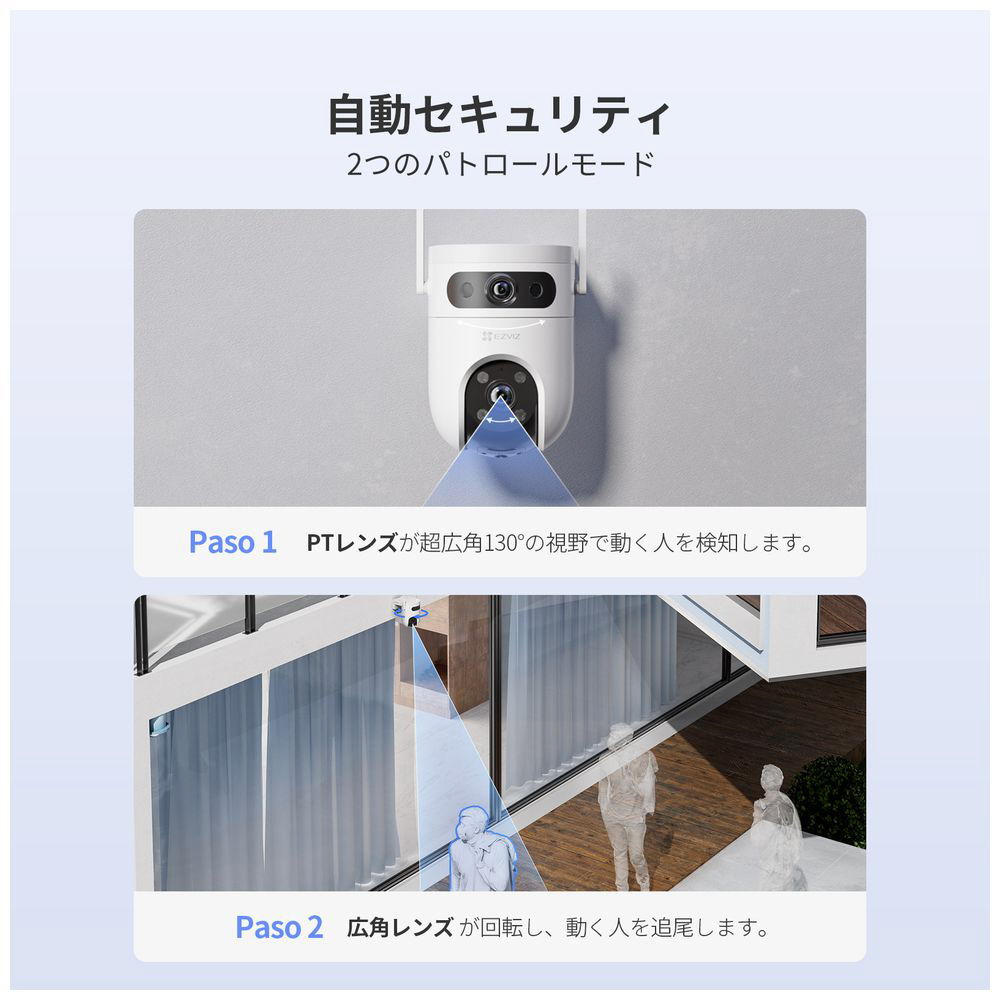 EZVIZ独自のデュアルレンズテクノロジーにより、H9Cはプロフェッショナルを超えた比類のない保護を提供します。望遠パン・チルトレンズの上に広角レンズが搭載されており、この2つのレンズが独立して、または一緒に動作するため、通常のカメラよりもはるかにスマートです。