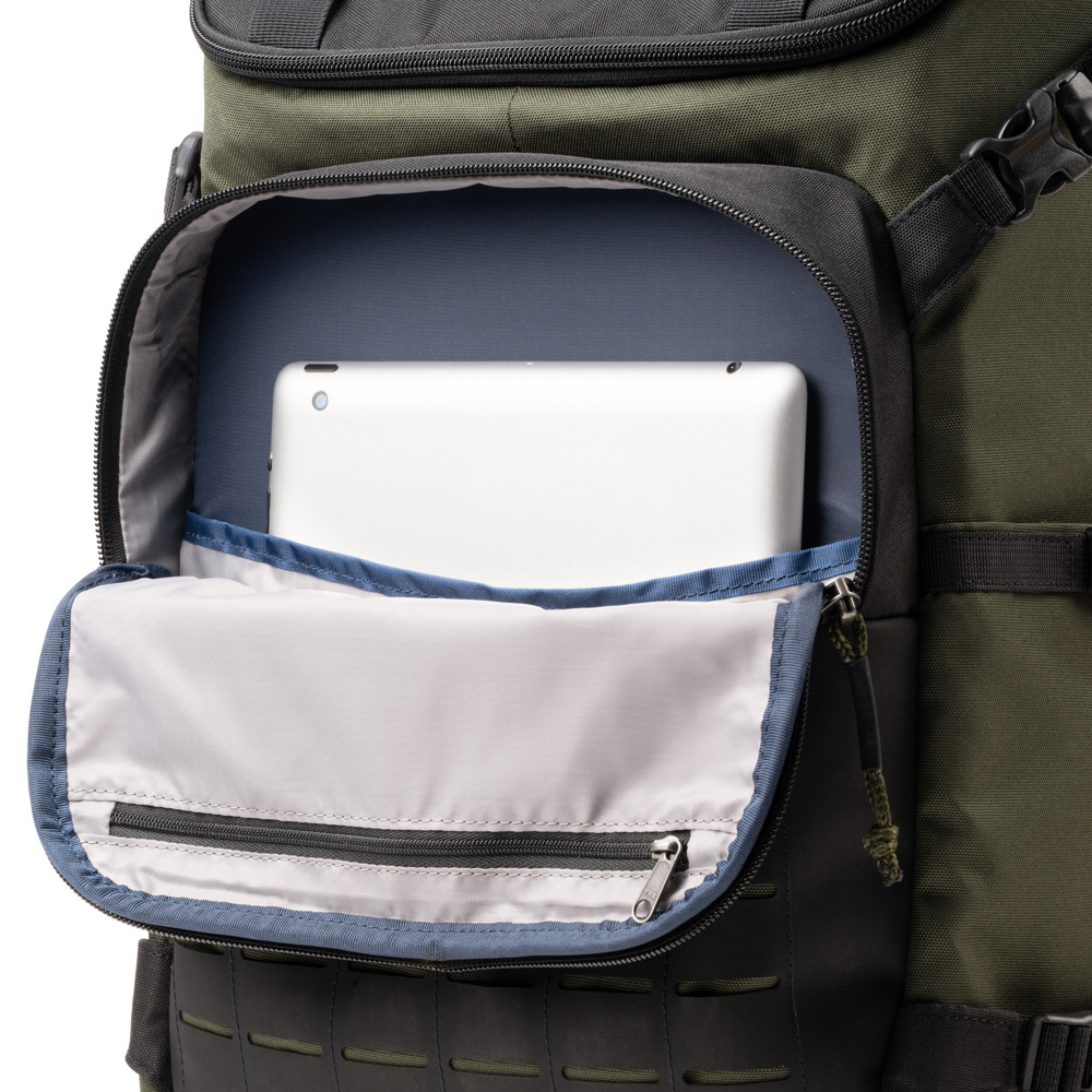フロントポケットには機材以外の日用品のほか、タブレットを収納可能。20Lには12.9インチ、14Lには8インチまでのタブレットを収納できます。また、20Lのみ16インチまでのノートPC用収納部をバックパネル内側に備えています。