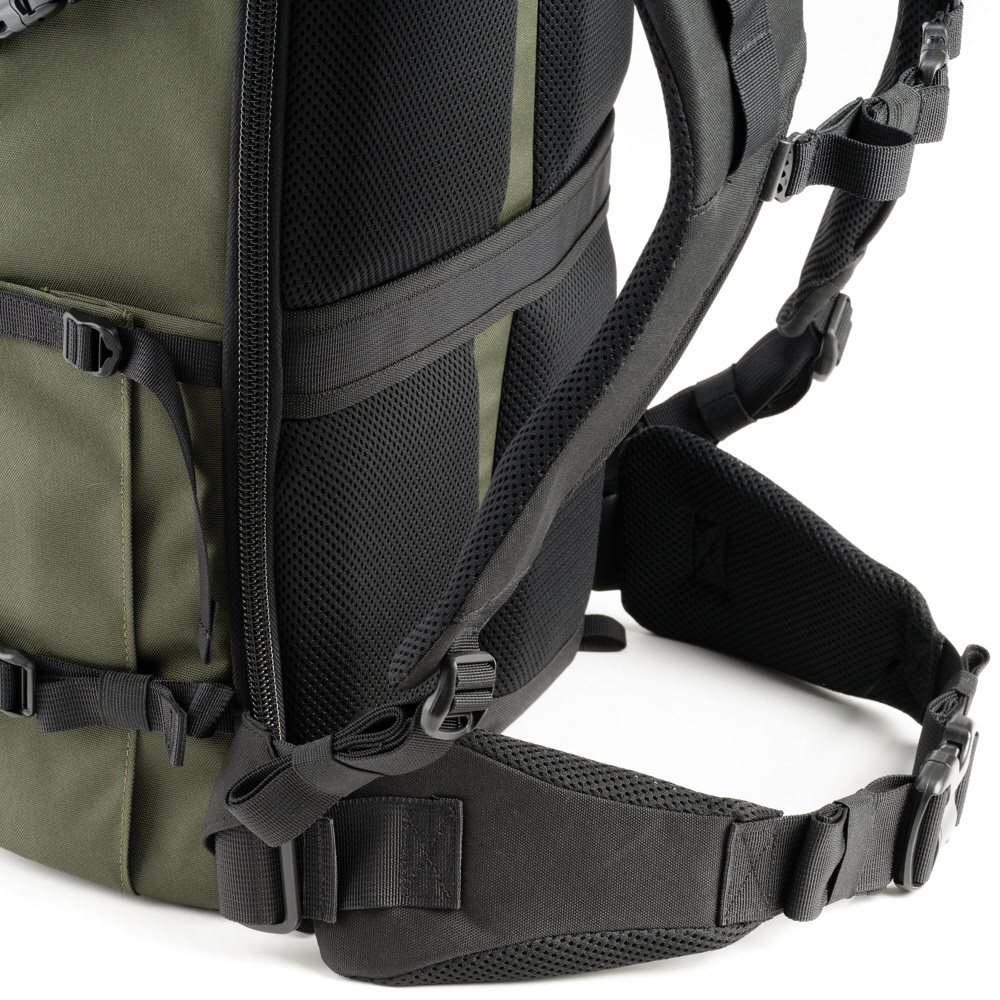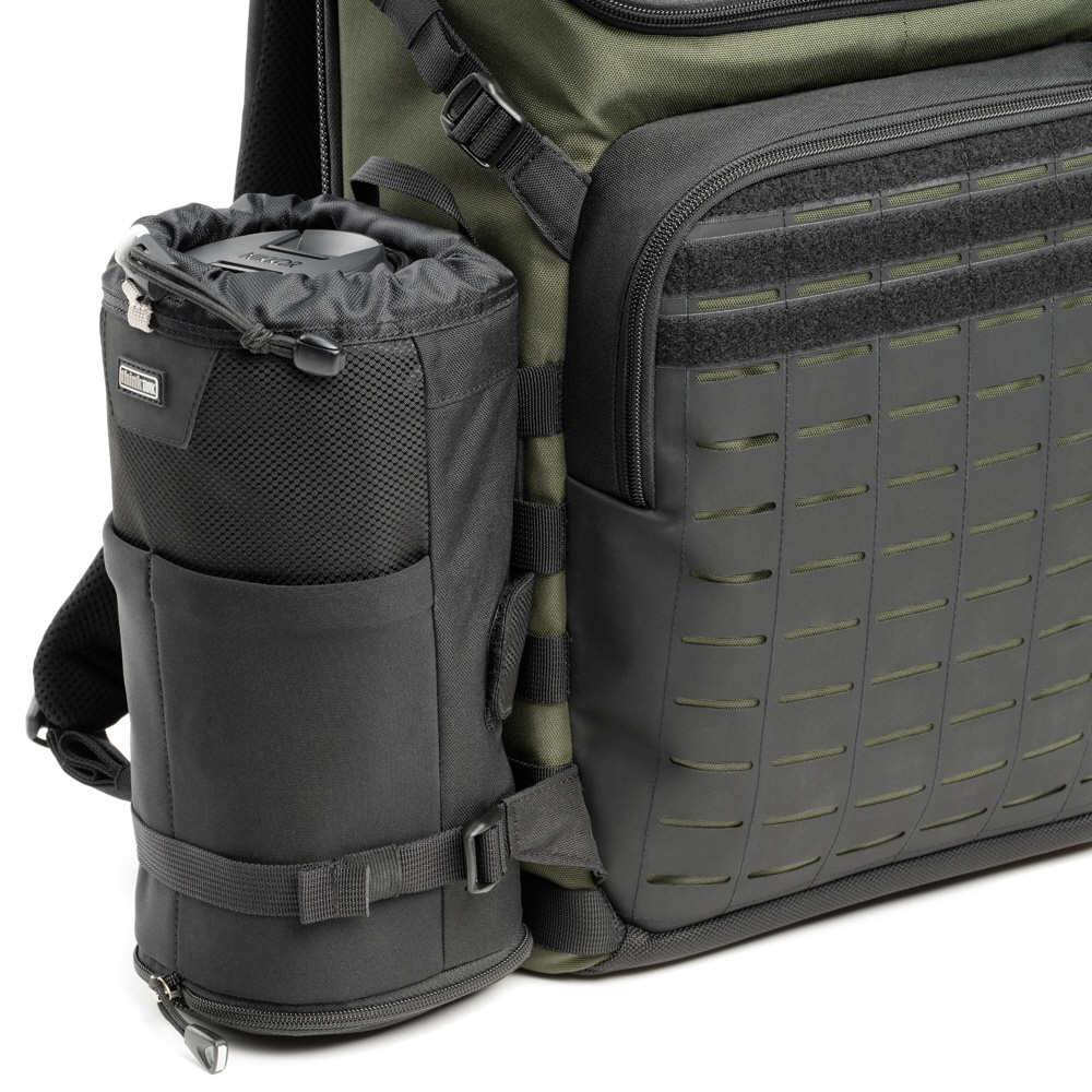 右側に設けられているサイドポケットにはウォーターボトルや三脚を収納可能で、さらに三脚等を固定できるバックル、アジャスター付きのコンプレッションストラップが付いており、安定した持ち運びを叶えます。