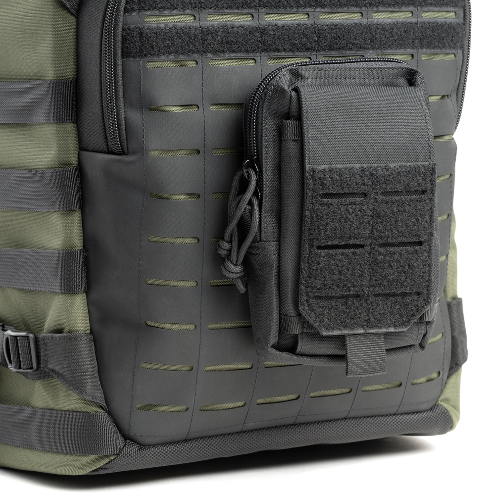 バッグのフロントパネルにはレーザーカットされたモールパネルを備え、複数のアタッチメントポイントがあり、ポーチ等を取り付けて容量の拡張もできます。ポーチはバッグ左側にも取り付けが可能で、より多くの荷物を持ち運びたい場合に便利です。