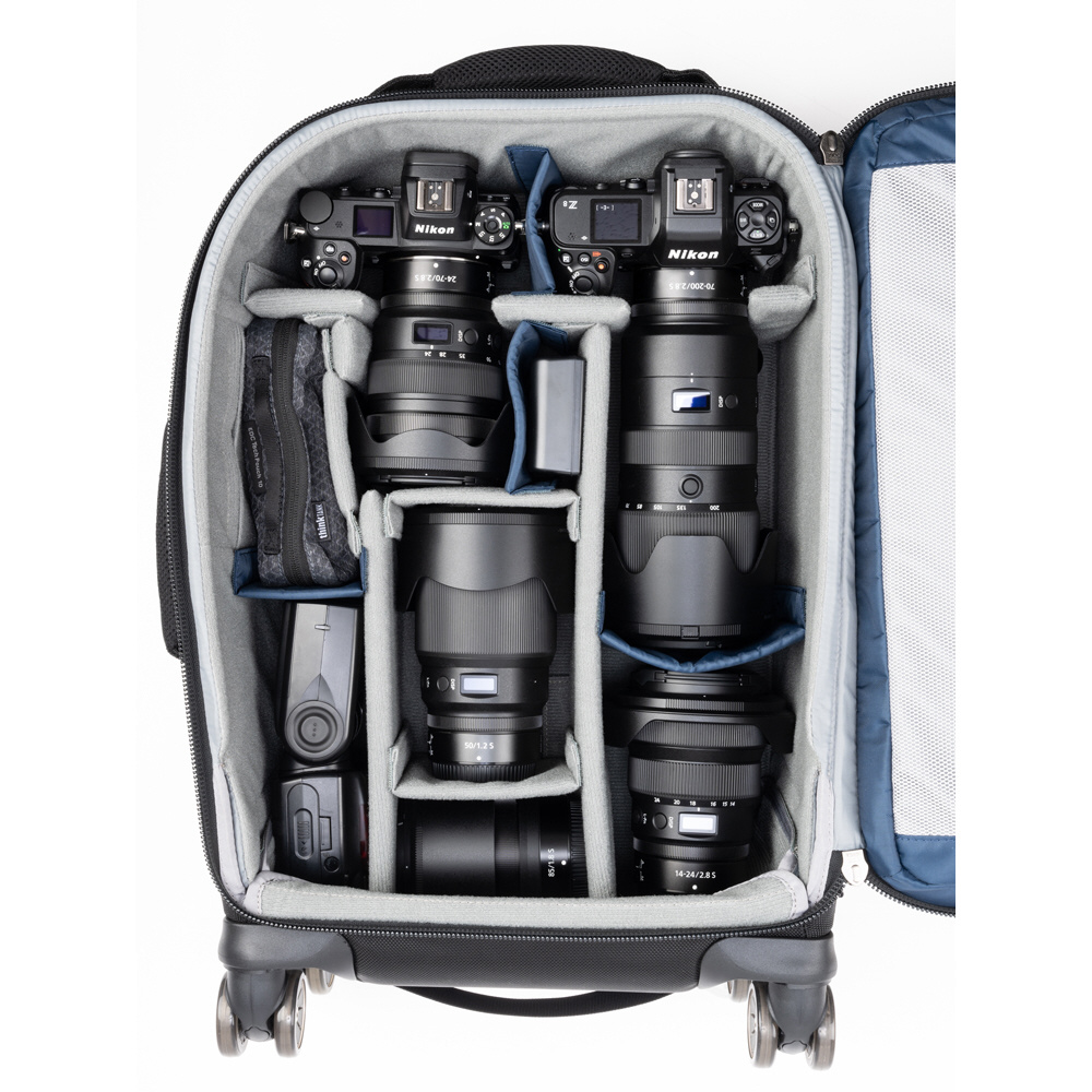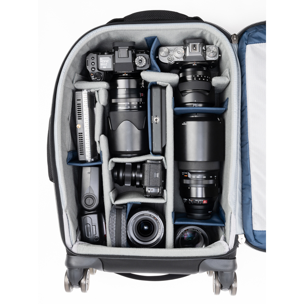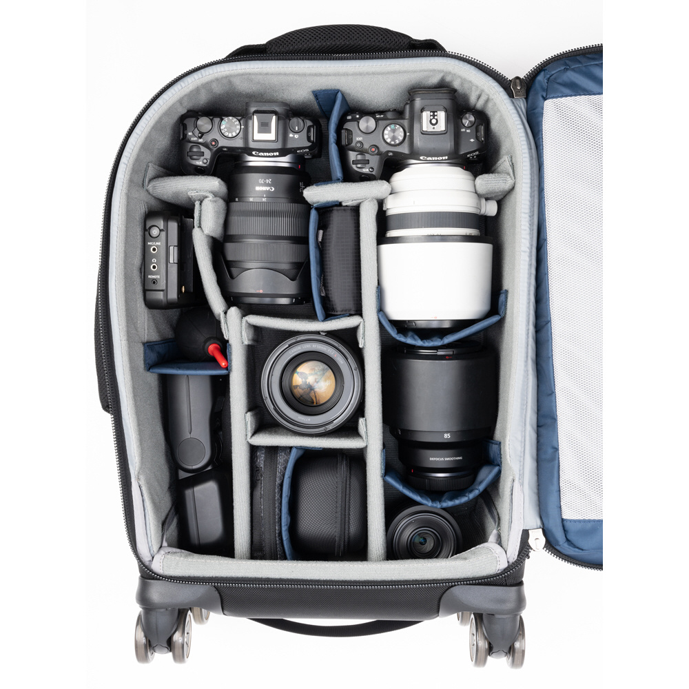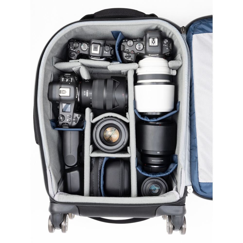 国内線100席以上の航空機に持ち込み可能なサイズで、レンズを装着したグリップ付き一眼レフ1台と中型一眼レフ1台、レンズ数本が収納できます。