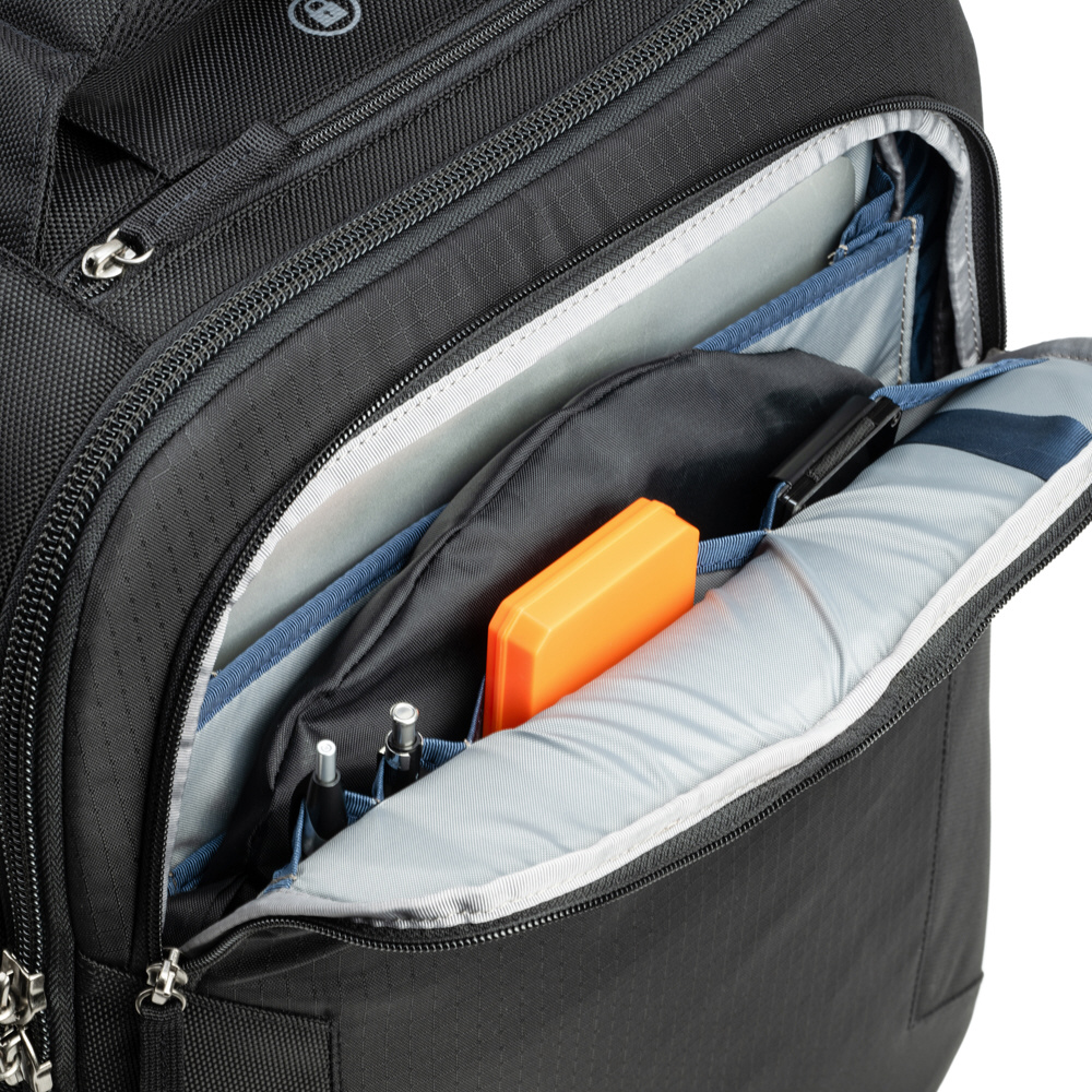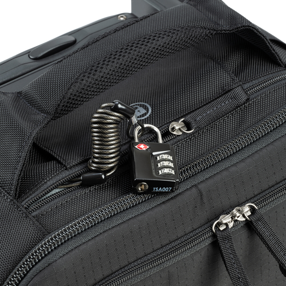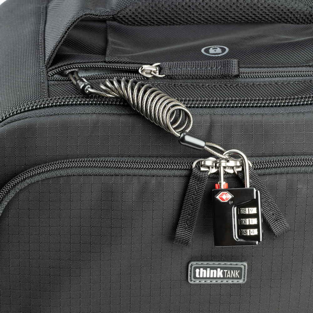 メインコンパートメント開口部のジッパーにはTSAロックを採用し、安心して撮影機材を持ち運べます。トップポケットには南京錠付きのセキュリティケーブルが付属します。