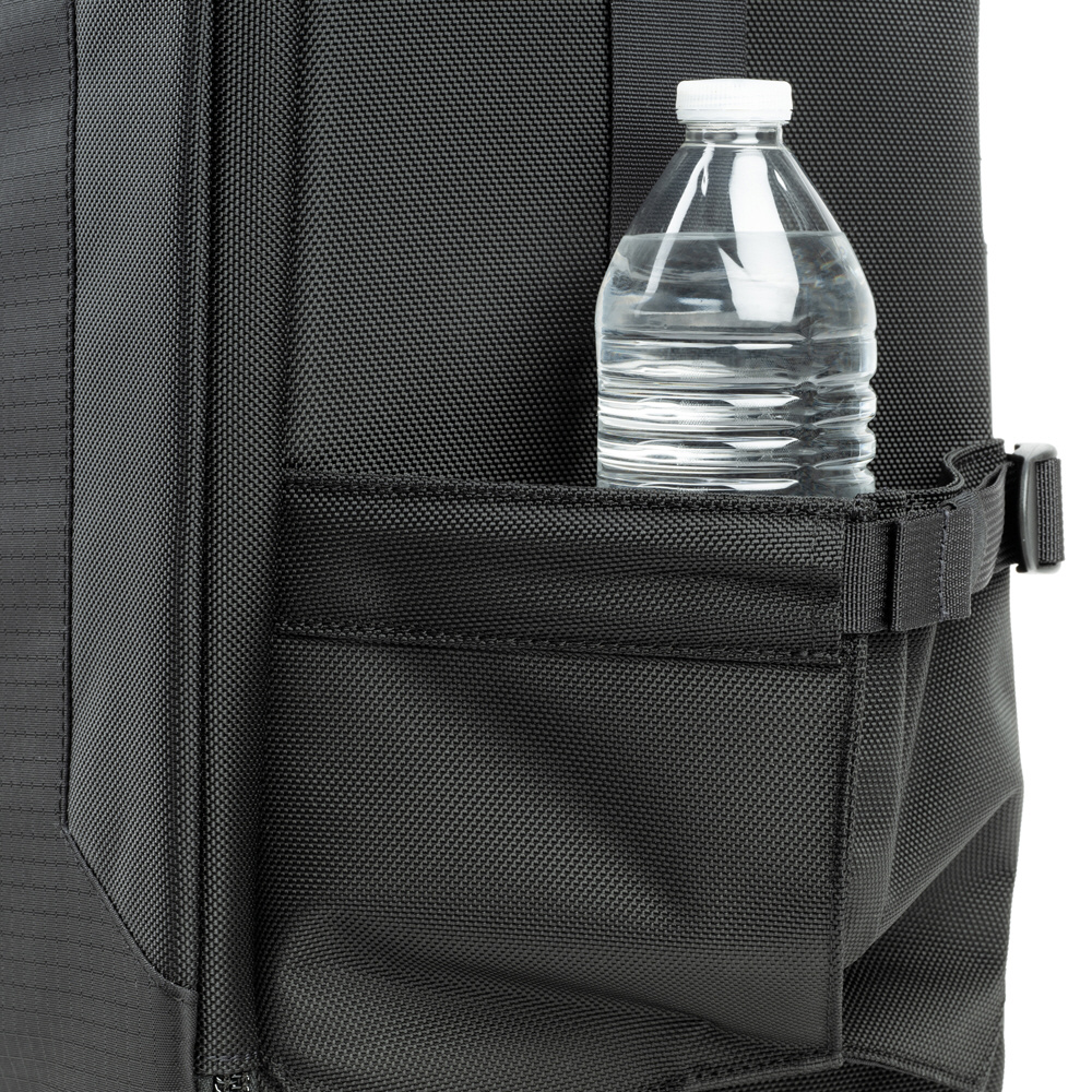 さらに、ストラップ付きのサイドポケットには水筒や三脚も収納可能で、これにより、必要な機材を一つのバッグにまとめ、効率的に移動や撮影準備を行えます。三脚収納時に固定するためのコンプレッションストラップが付属しています。