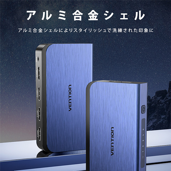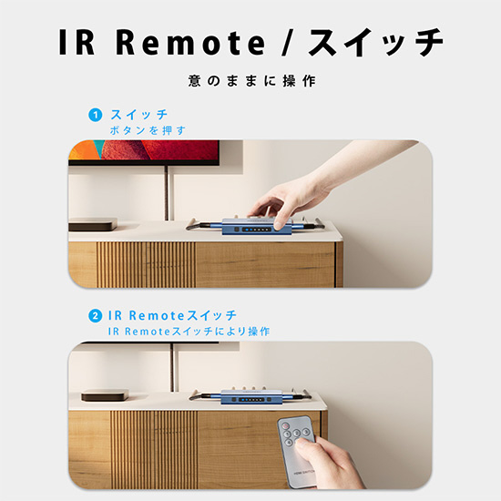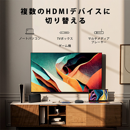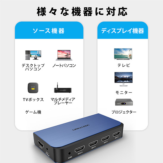 4K出力に対応したHDMIセレクターです。スピーカーへ音声のみを抽出して出力ができ、リモコンを使って手元で切り替えが可能です。