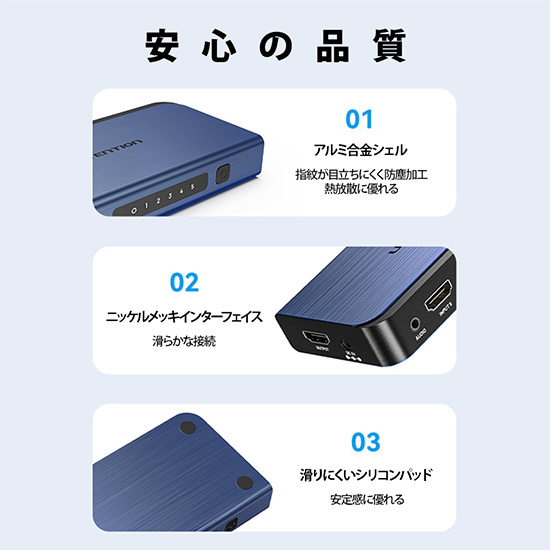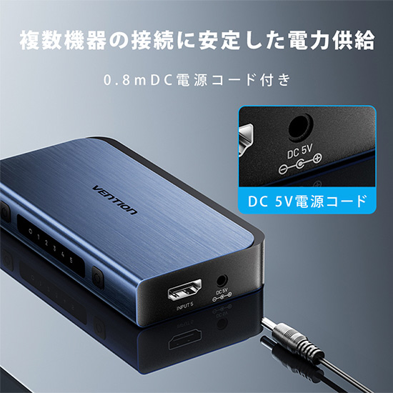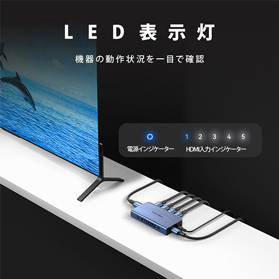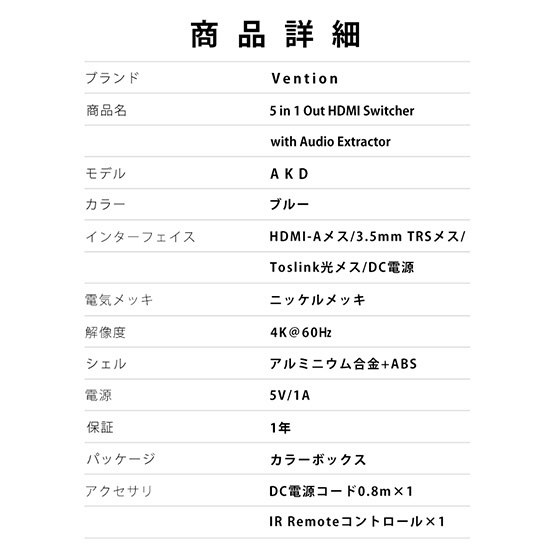 | 商品名 | 5 IN 1 OUT HDMI スイッチャー オーディオセパレーター搭載 AK-6118 [5入力 /1出力 /4K対応 /手動] |