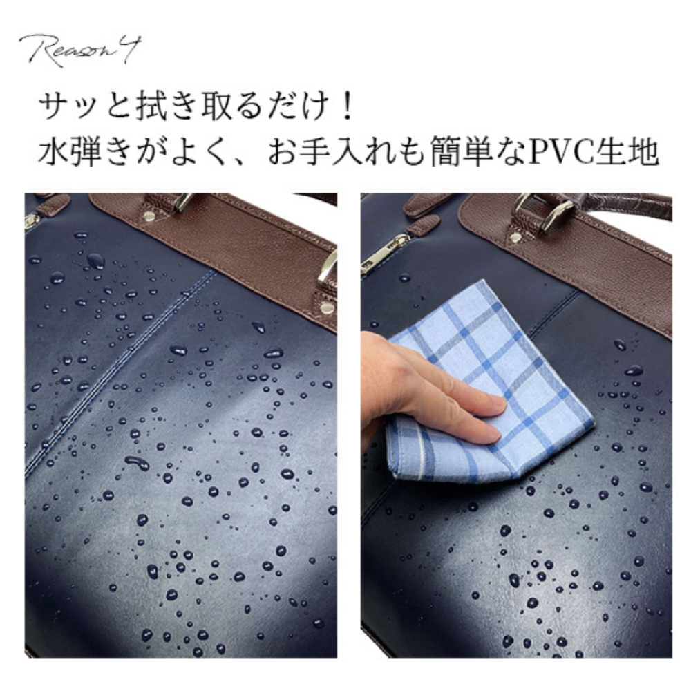 タブレット対応、B4サイズ対応、さらに自立設計で使い勝手抜群のビジネスバッグ。形崩れしにくいフチ巻き仕様が、高級感と耐久性を両立。落ち着いた光沢のPVC素材は雨や汚れに強く、お手入れも簡単です。