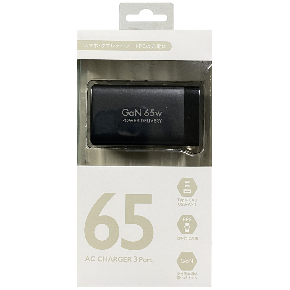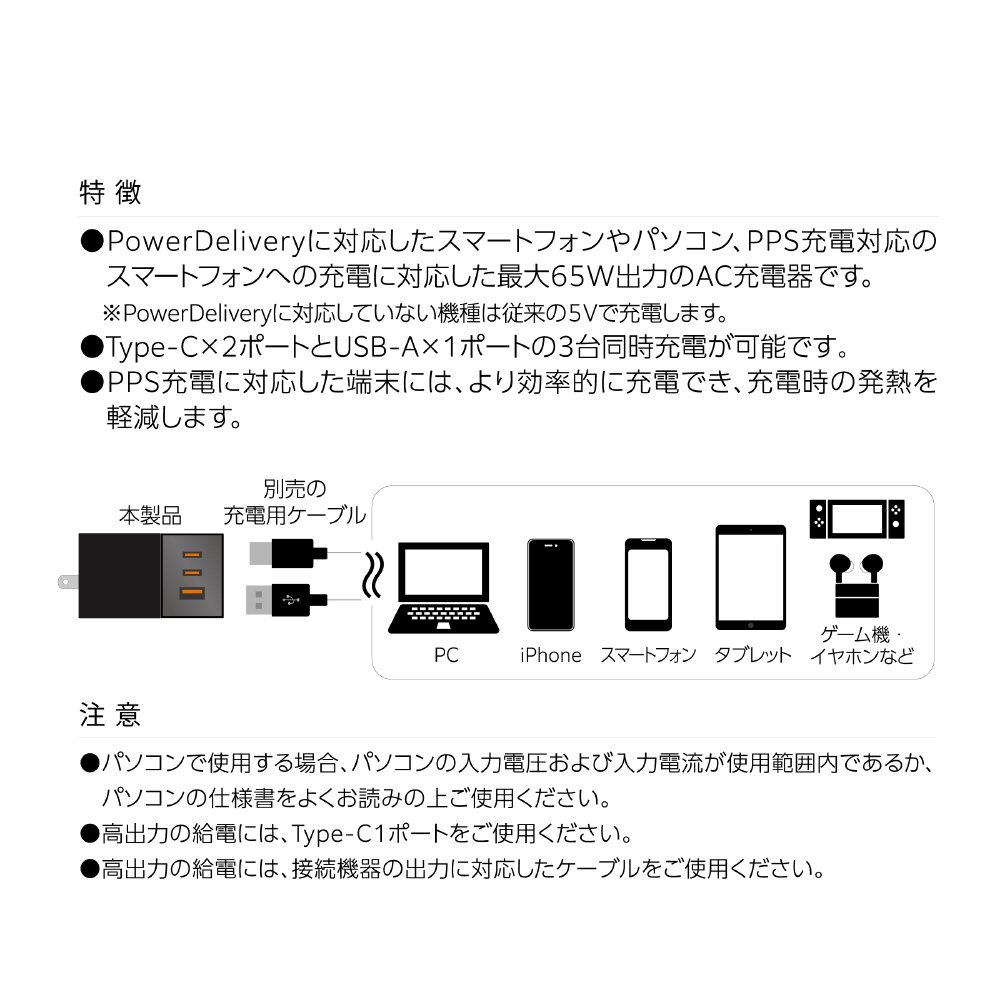 【GaN】【PPS対応】【ノートPC充電対応】PowerDelivery65W出力 AC-USB充電器 3Port(C*2&A) ブラック ACUC2-65PQGBK [3ポート /USB Power Delivery対応 /Smart IC対応 /GaN(窒化ガリウム) 採用]