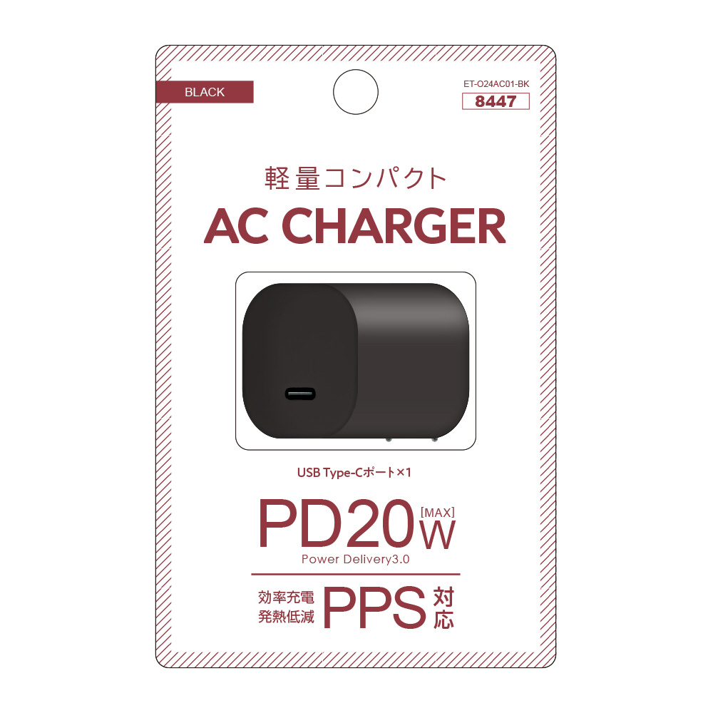 PD20W Type-C 1ポート 軽量コンパクトAC充電器 ブラック ET-O24AC01-BK