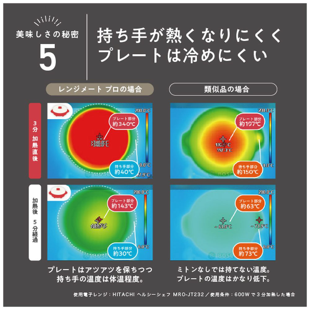 電子レンジから取り出した時も、持ち手は約40℃で触れても火傷の心配が少ないです。