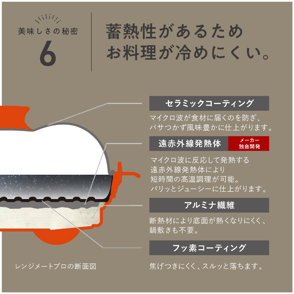 セラミックコーティングのふたがマイクロ波を遮ることで加熱ムラを防ぎます。