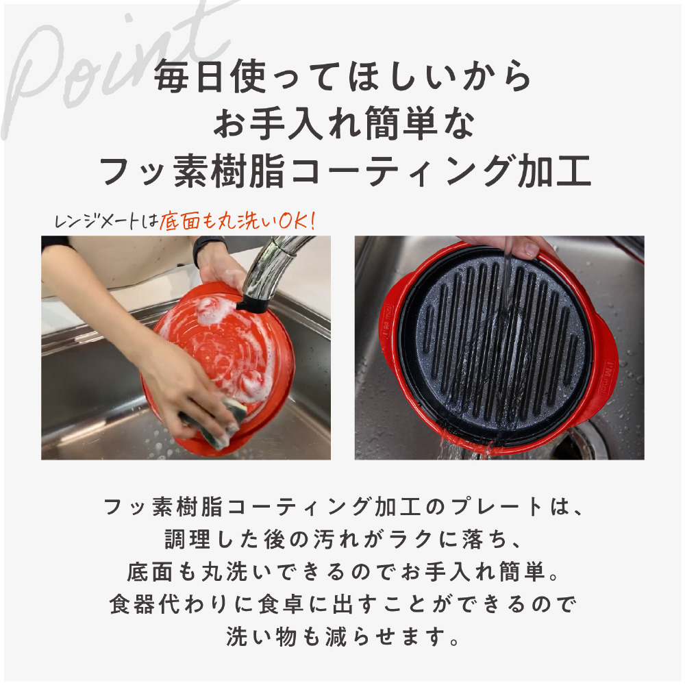フッ素樹脂コーティング加工のプレートは汚れがラクに落ち、底面も丸洗いできるのでお手入れ簡単。