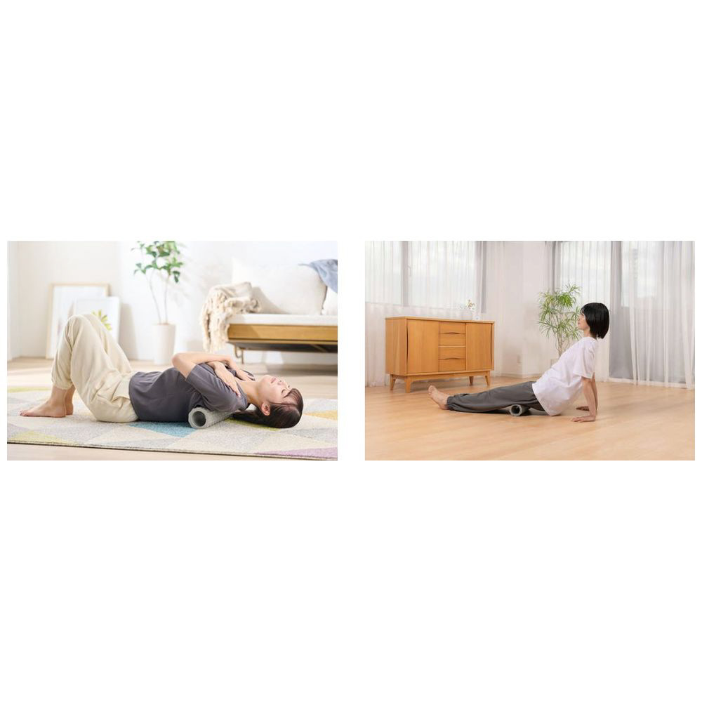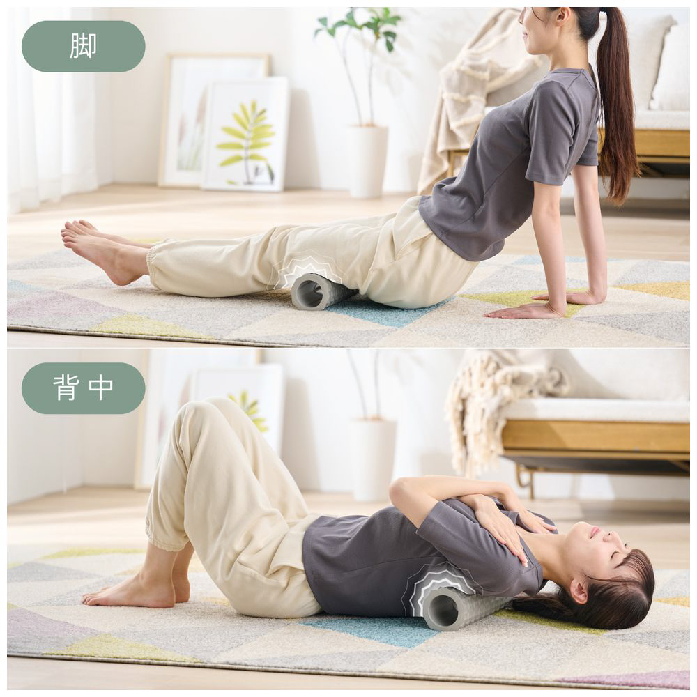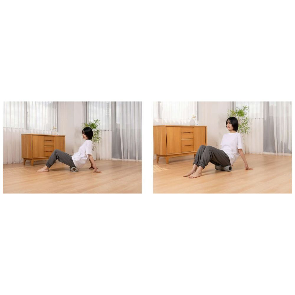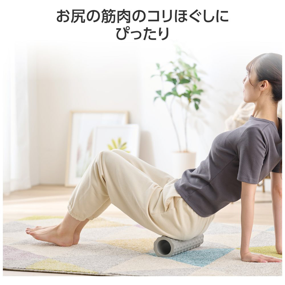 お尻をローラーにのせて、ゆっくり転がしてください。表面の程よい凹凸が、コリをじんわりほぐします。