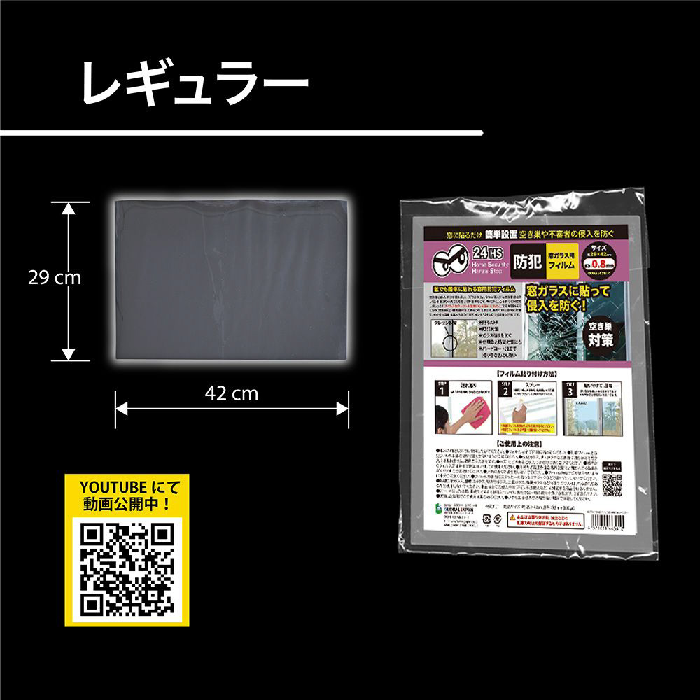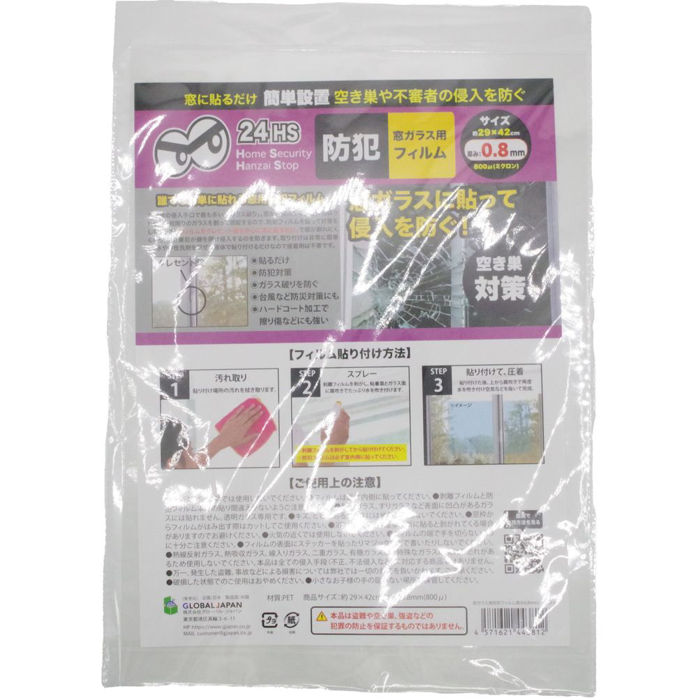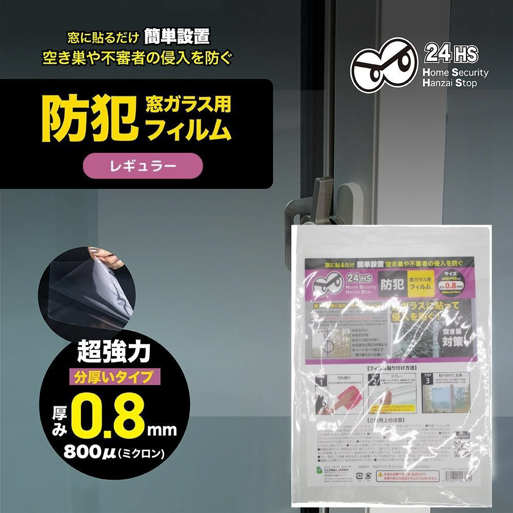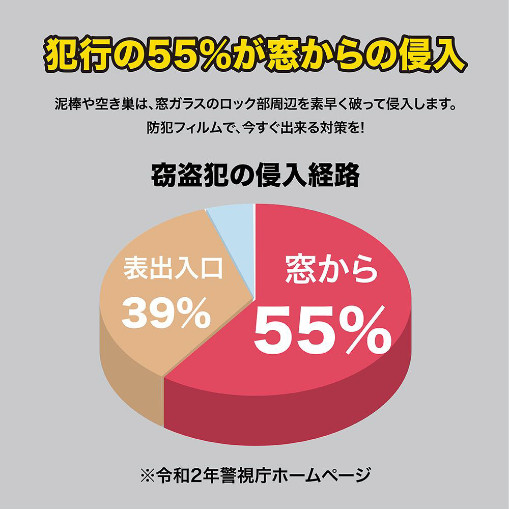 空き巣の侵入手口で最も多い、「ガラス破り」。窓から侵入する空き巣犯はクレセント錠周りのガラスを割って開錠するので、防犯フィルムを貼って対策しましょう!「フィルムをクレセント錠を中心に窓に貼るだけ」で窓が割れにくくなり、空き巣犯が鍵を開け侵入するのを防ぎます。複層フィルムでガラス破りを防ぎます。フィルム表面はハードコート処理を施し、かすり傷などにも強い素材です。取り付けは非常に簡単で、水や中性洗剤をまぜた液体で貼り付けるだけなので接着剤は不要です。台風などの災害対策、空き巣や強盗、台風や暴風によるガラスの飛散も防ぎます。【仕様】1枚入り