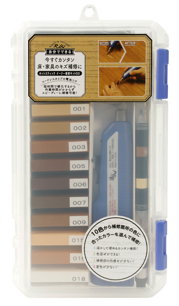 ●ホットスティック10種(充填補充剤)●電池式補修コテ※単三電池3本使用(別売り)●専用ヘラ●調色プレート●スチールウール×1●木目書きペン×1●収納ケース